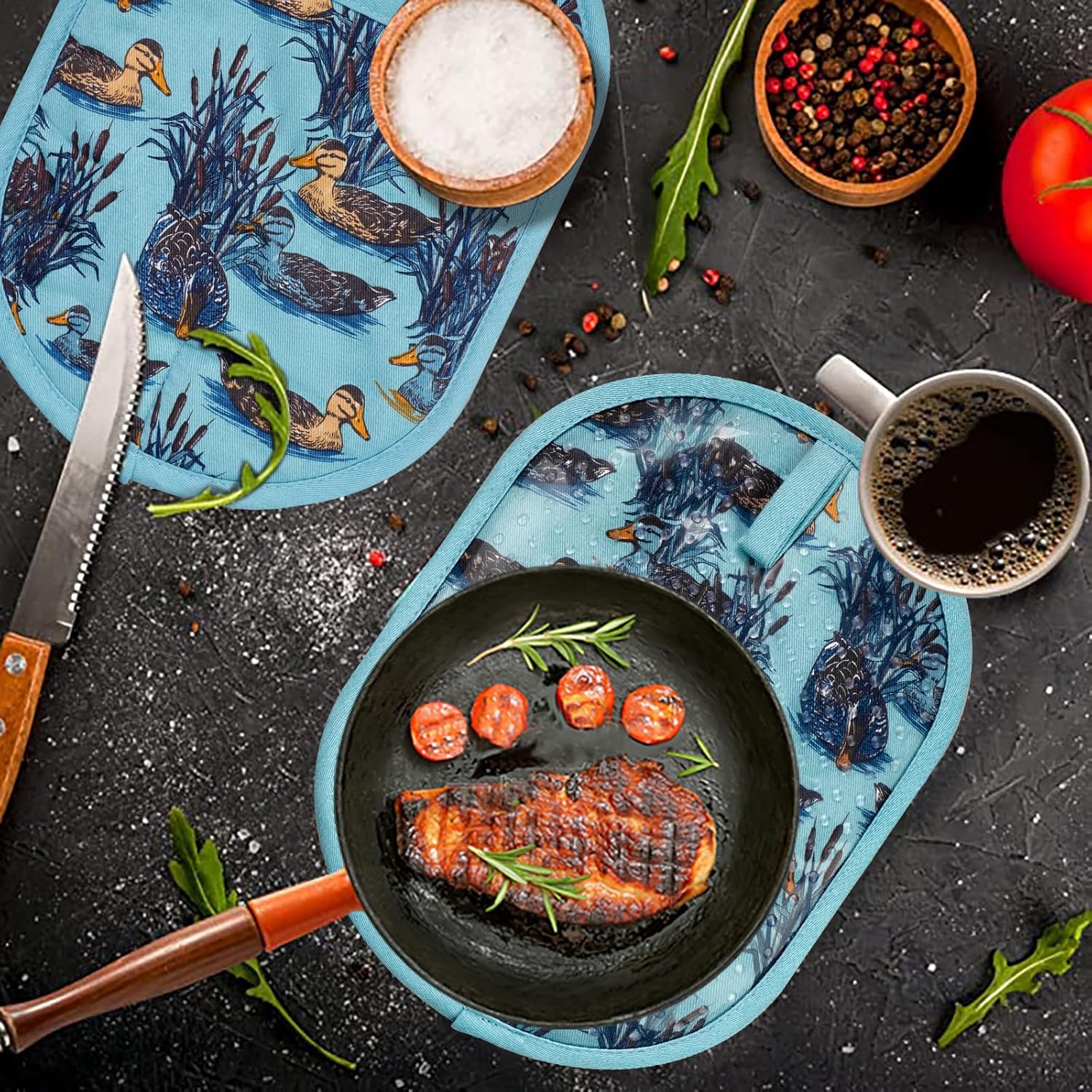 - 1. UNIQUE DESIGN: this pack of two oval shaped 7.5“x10” Pot Holders, different design for choice to match your kitchen.