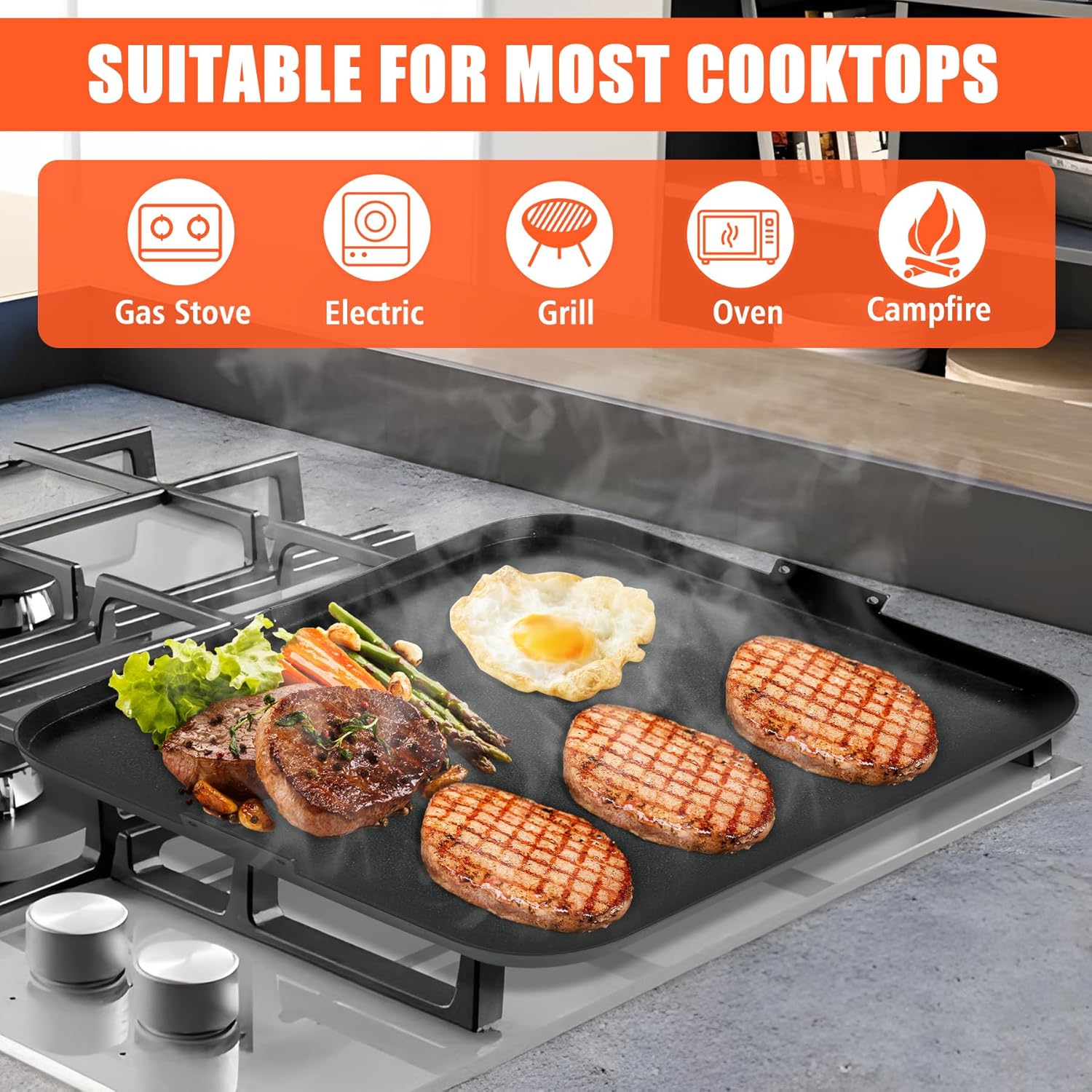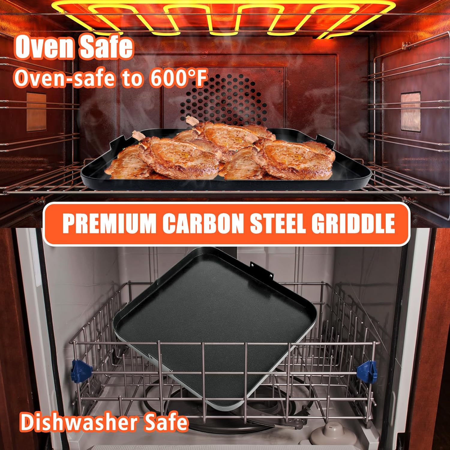 - STURDY AND DURABLE: This griddle pan is made of durable heavy-duty carbon steel, high temperature, rust and corrosion resistant, sturdy and durable, providing you with your favorite outdoor grilling flavors and unmatched heat retention, even heat distribution and fast heat conduction for outstanding cooking results