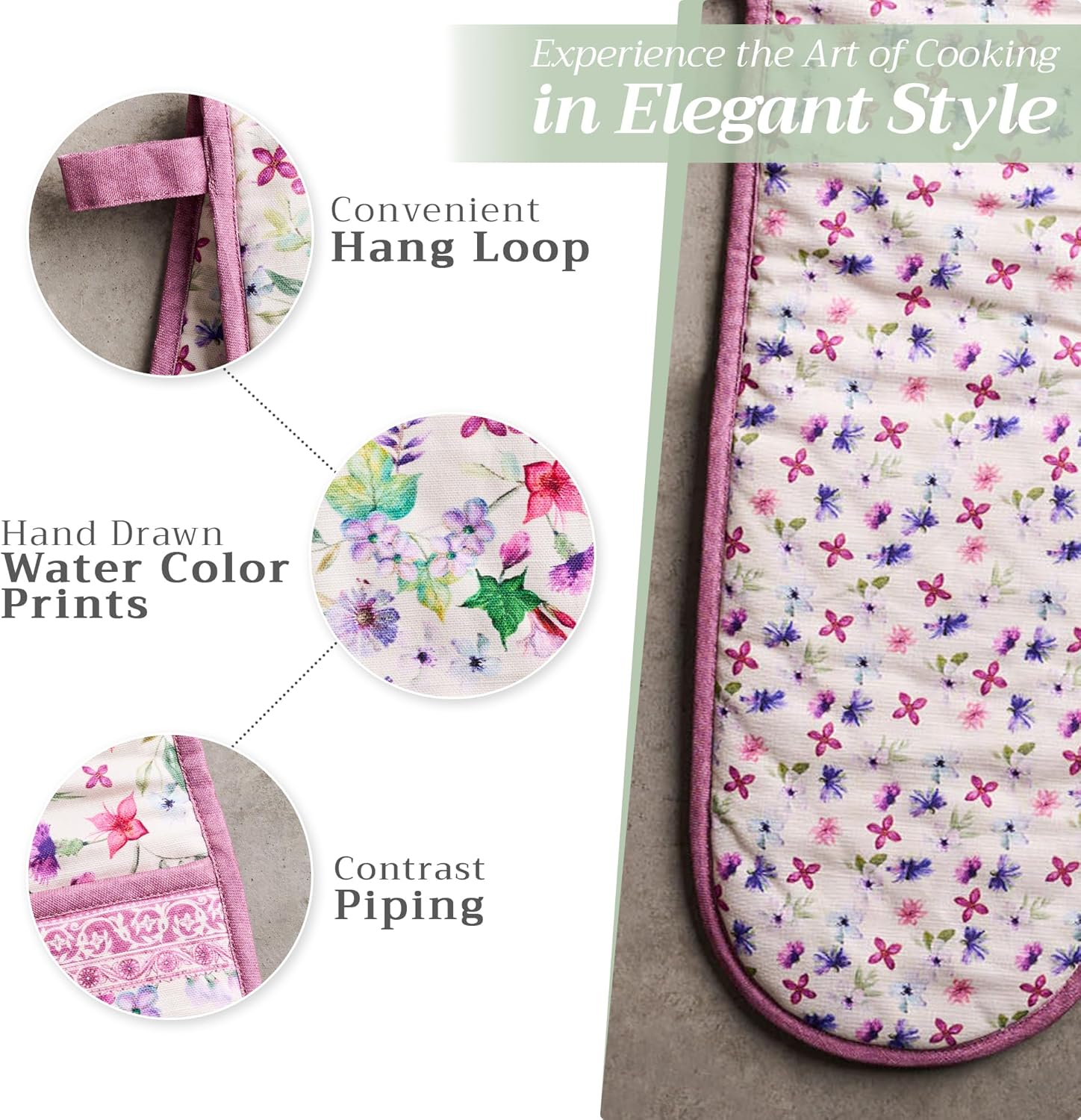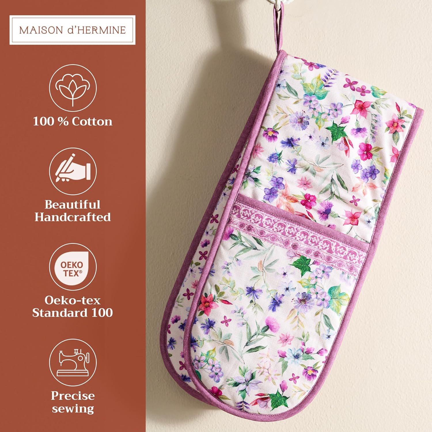 - Package includes: Includes 1 double oven mitt sized 7"x35". Perfect for handling hot cookware safely while adding a touch of European elegance to your kitchen. Designed in Europe and made in India with care