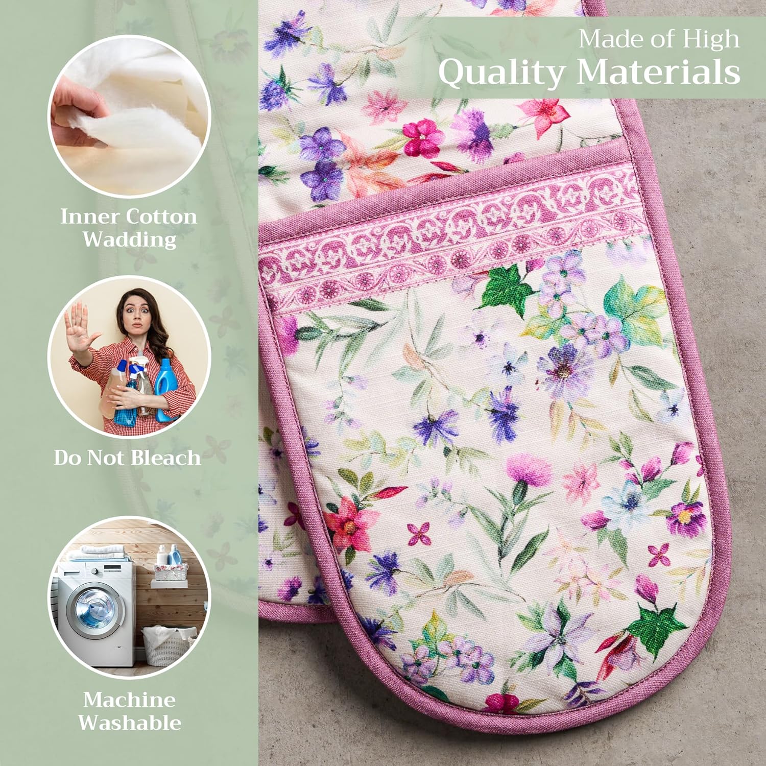 - 100% Quilted cotton: Crafted from premium quilted cotton for superior heat resistance and durability. This double oven mitt offers a soft, flexible grip and protects your hands during baking, roasting, or grilling