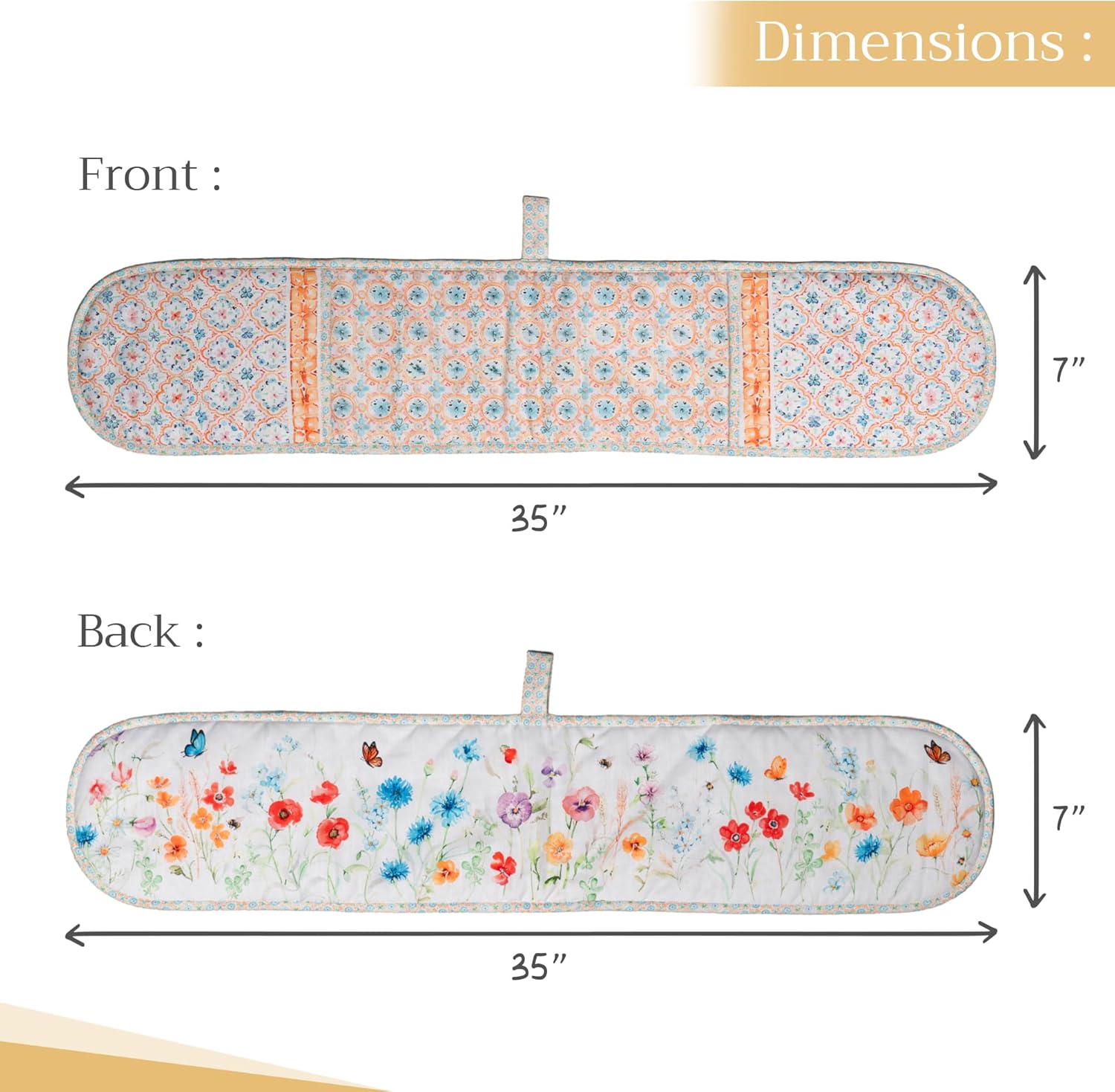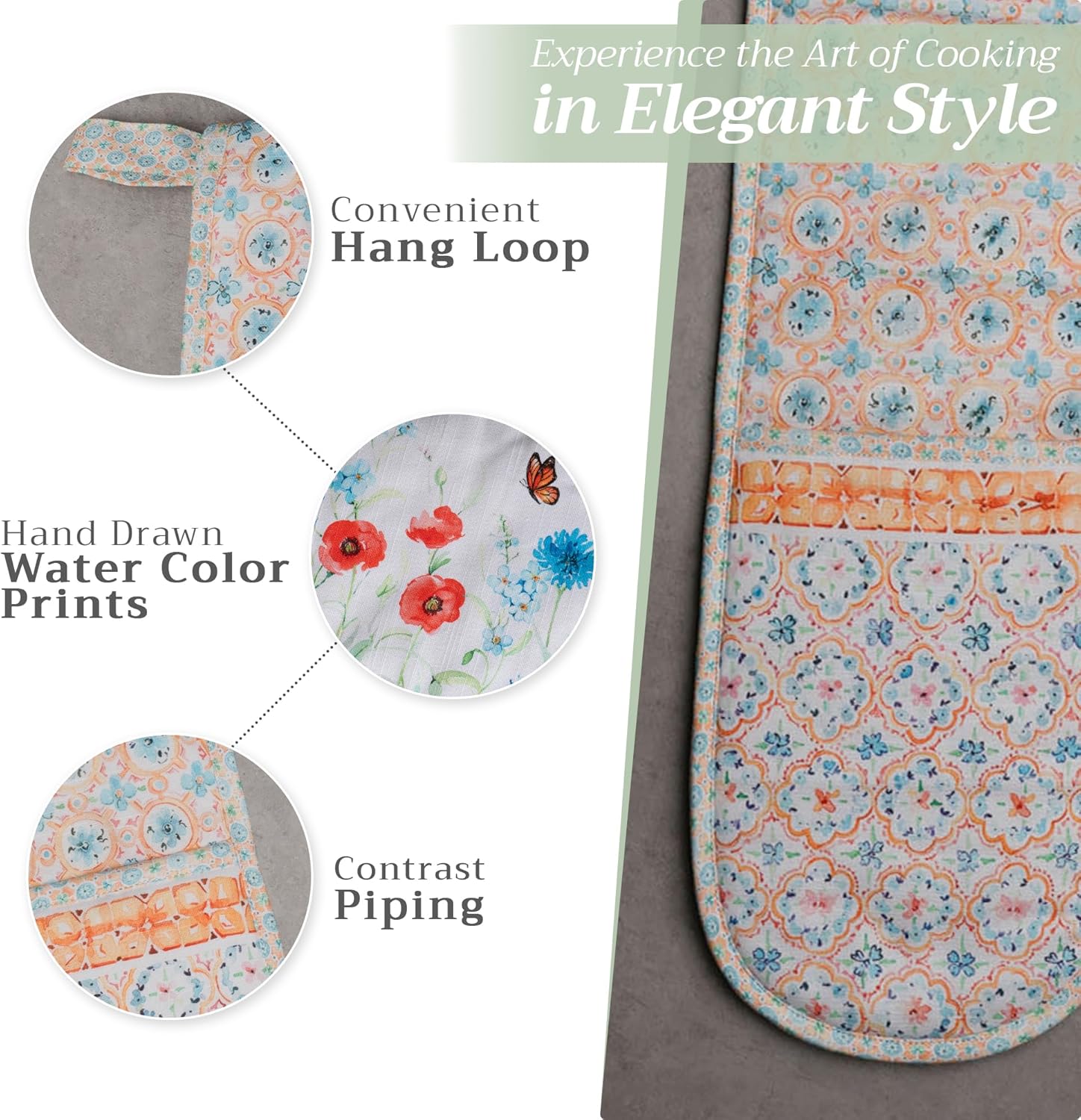 - Package includes: Includes 1 double oven mitt sized 7"x35". Perfect for handling hot cookware safely while adding a touch of European elegance to your kitchen. Designed in Europe and made in India with care