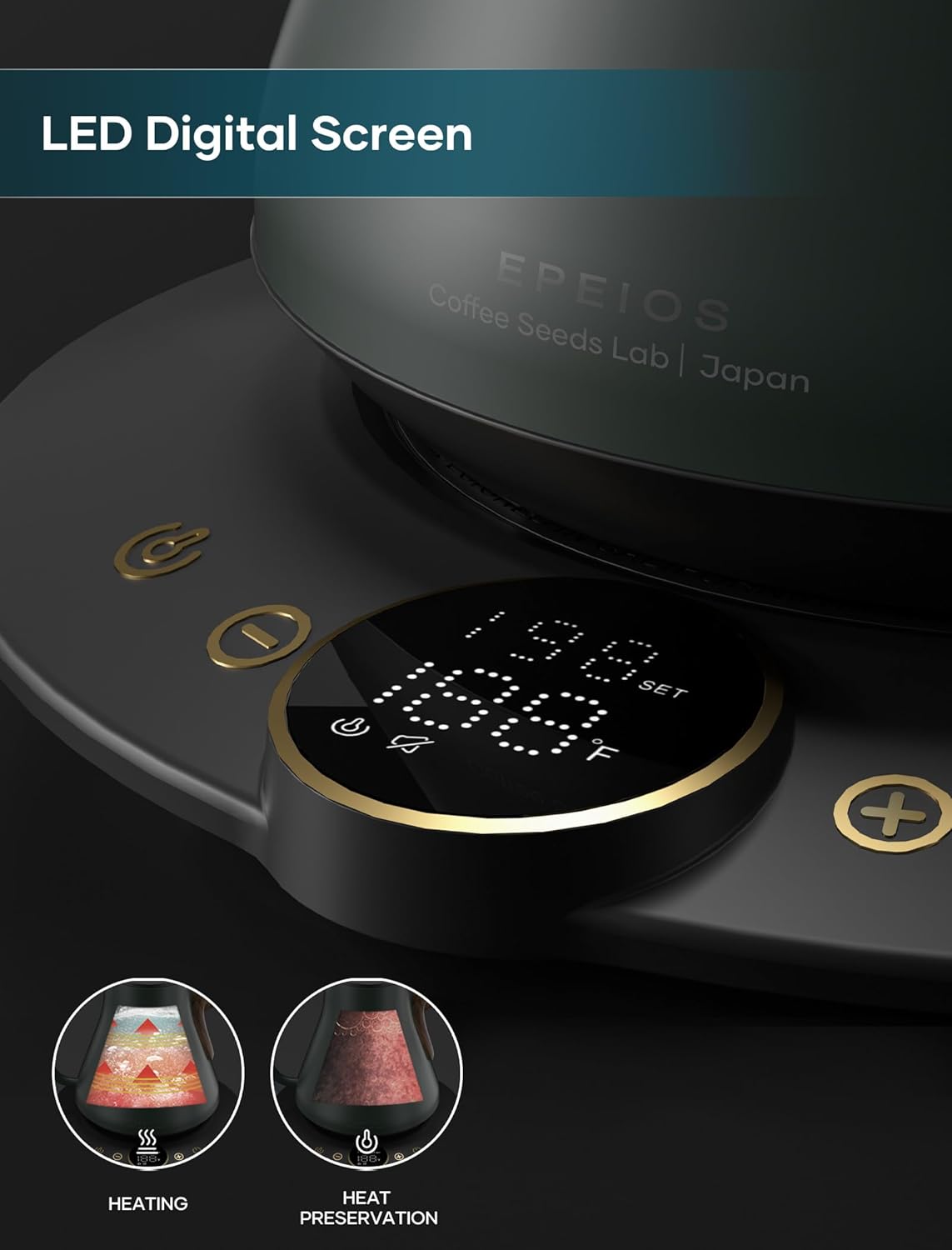 - ±1℉ Temperature Accuracy - The intelligent base's built-in temperature control program. The program will adjust the heating power when the water temp approaches the desired temp according the temp probe detects the temp change.