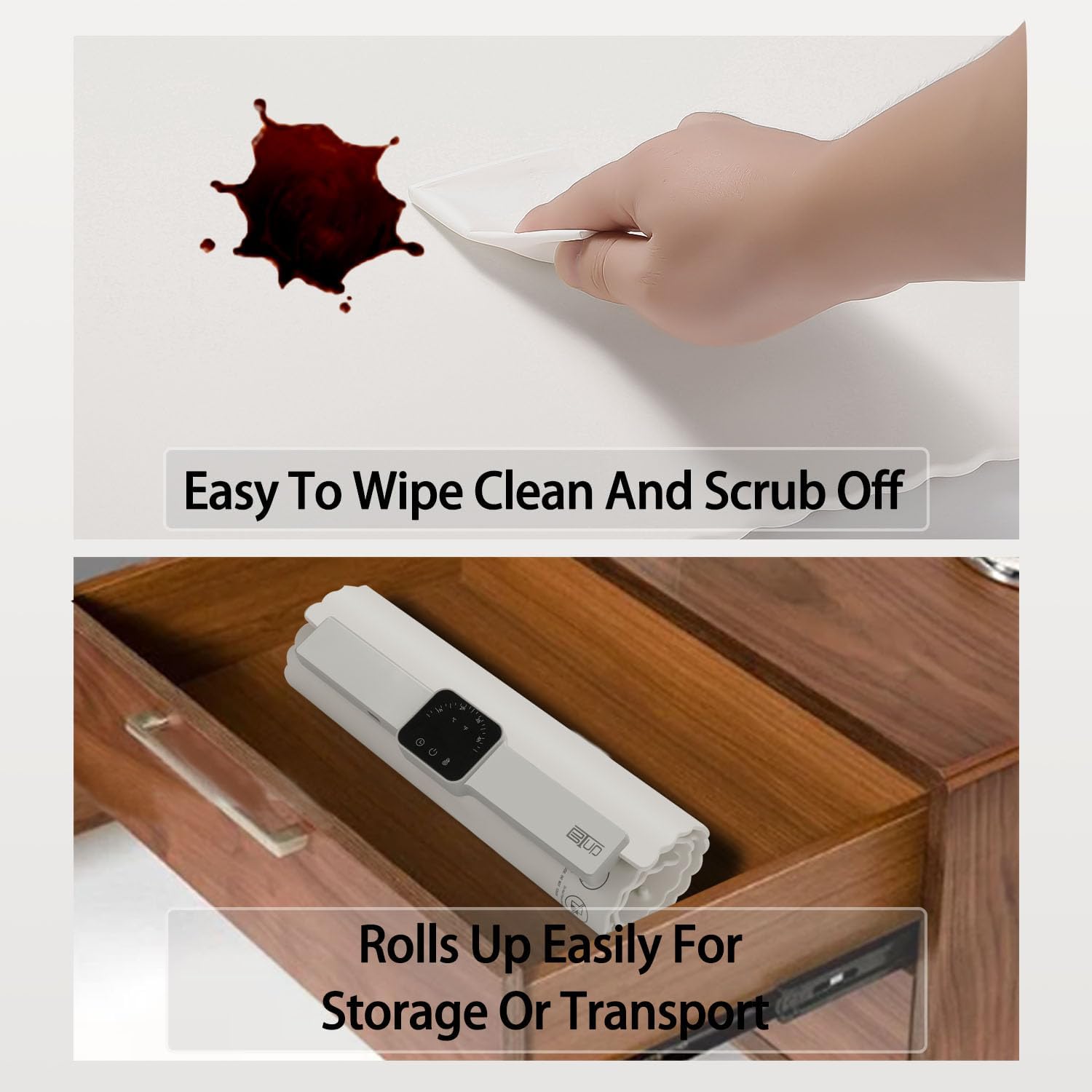 - đź’—Rollable For Easy Storage & Easy to Clean Surface: Measuring 26"L x 15.35"W x 0.83"H , BTUP Electric Warming tray Features a Smart Foldable Roll Up Design that Ensures Easy Storage &Space-Saving, Premium Silicone Nano Material Featuring Splash-proof and Stain-Resistant or Oil Resistance Properties.