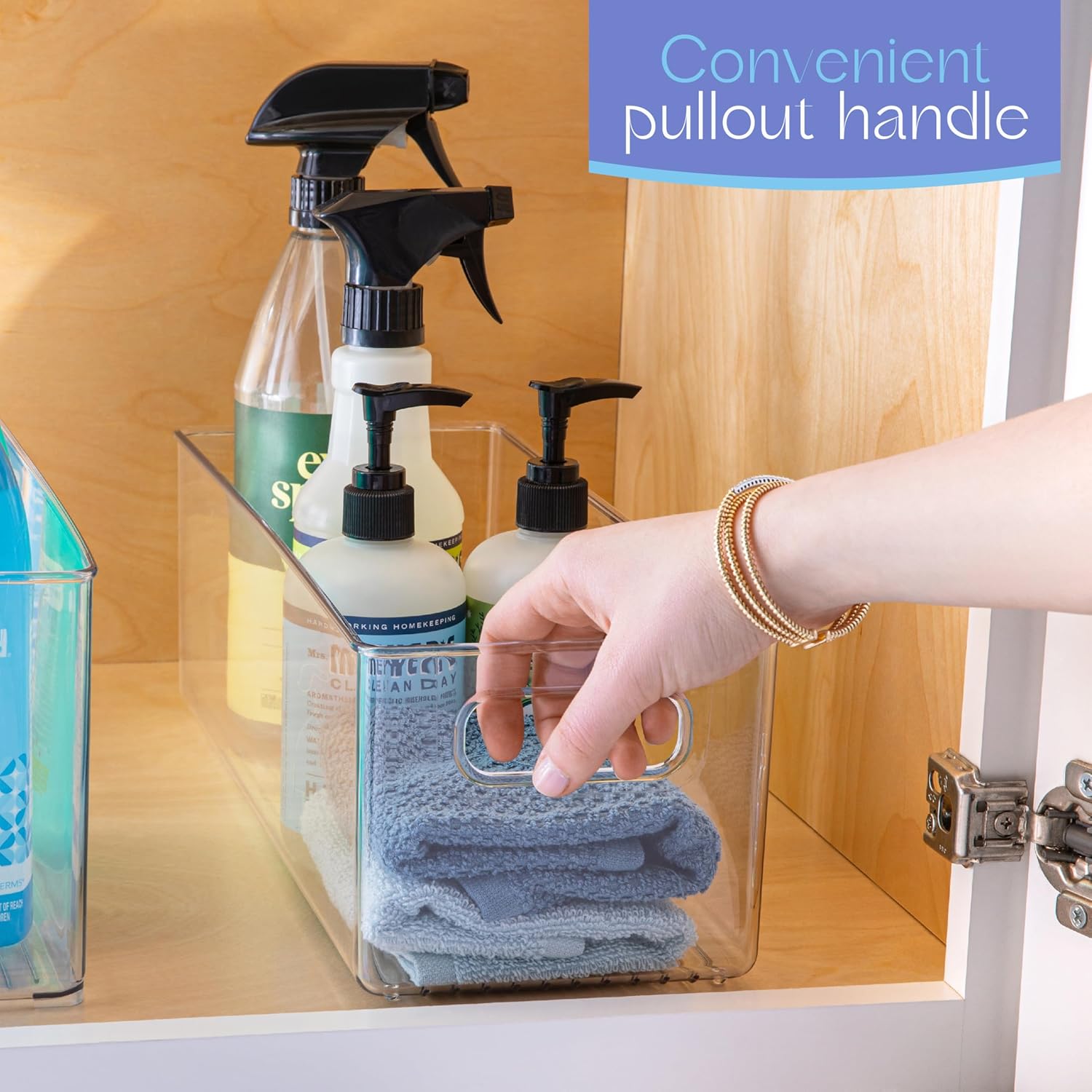 Plastic Food Storage 4 Pack Clear Container Bin with Handles for Organizing Kitchen, Pantry, Fridge, Freezer, Pantry, Bathroom. 14"x6"5"