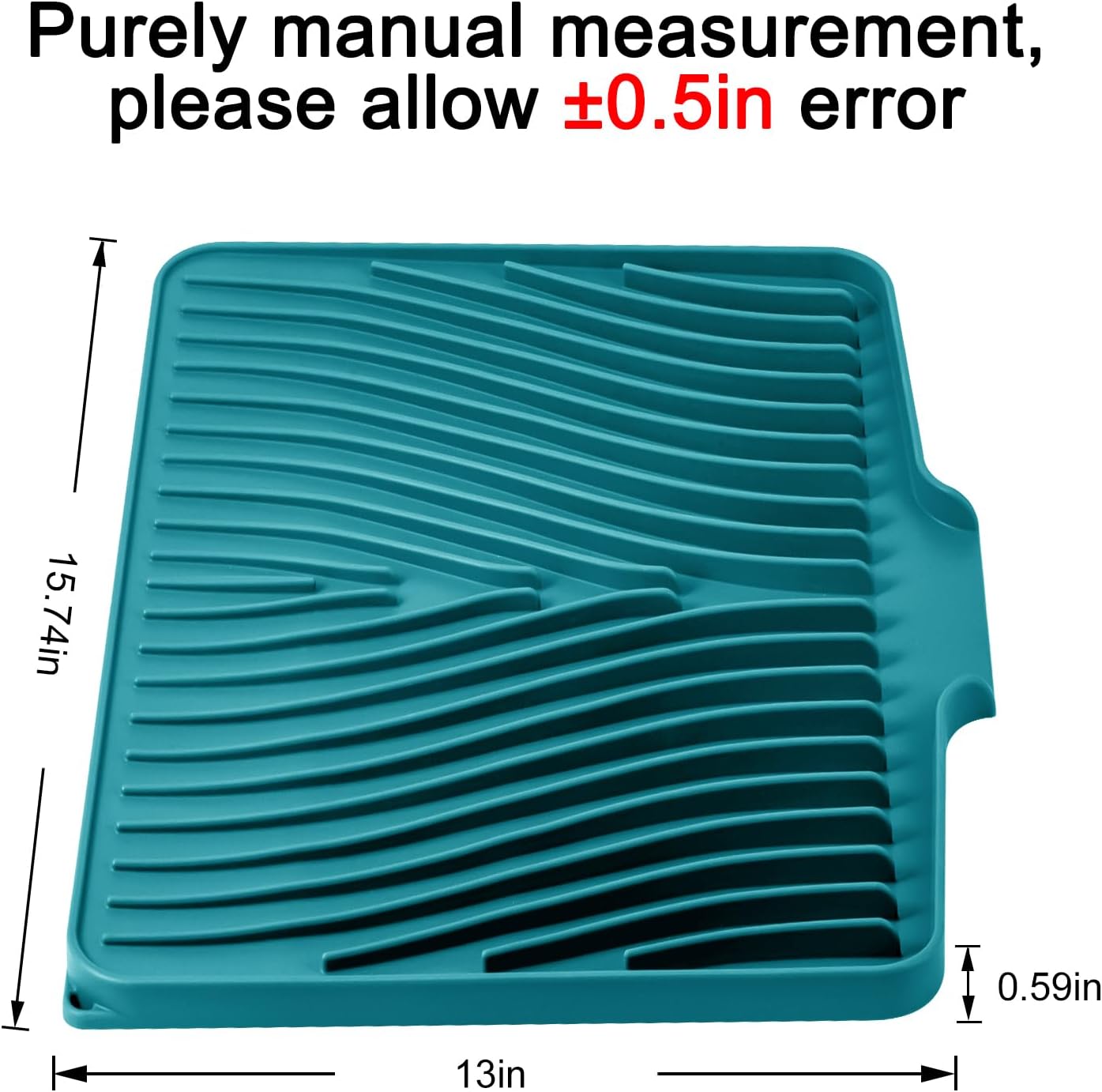 - Quick Drying Mat: TIKNIK dish drying mat measures 15.8" x 13", where washed dishes can be placed for air drying. The folding, raised and innovative design of the quick dry dish mat allows air to circulate under the dishes,and features unique diagonal ridges to easily remove moisture, and a specially designed rim that lets water drain directly into the sink. This keeps your countertops dry and clean, and says goodbye to wet countertops.