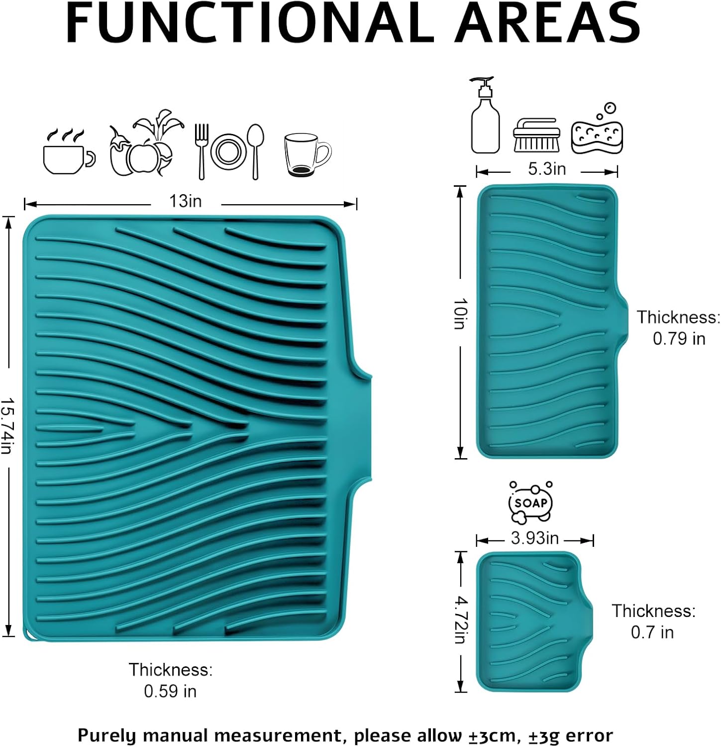 - Quick Drying Mat: TIKNIK dish drying mat measures 3 size, where washed dishes can be placed for air drying. The folding, raised and innovative design of the quick dry dish mat allows air to circulate under the dishes,and features unique diagonal ridges to easily remove moisture, and a specially designed rim that lets water drain directly into the sink. This keeps your countertops dry and clean, and says goodbye to wet countertops.