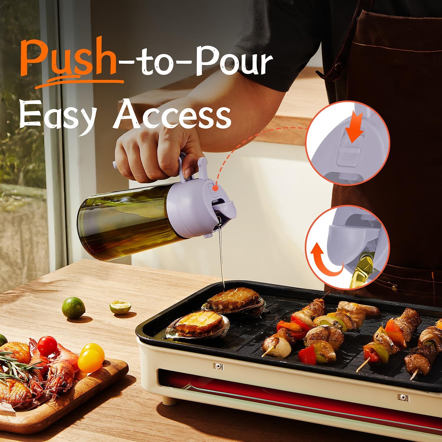 - Innovative Spray Nozzle Design: Delivers precise control—quick presses release a fine mist, while slow presses provide a steady stream. Whether you're preparing meals in the kitchen or barbecuing outdoors, this reliable cooking oil sprayer doubles as one of your must-have grilling accessories