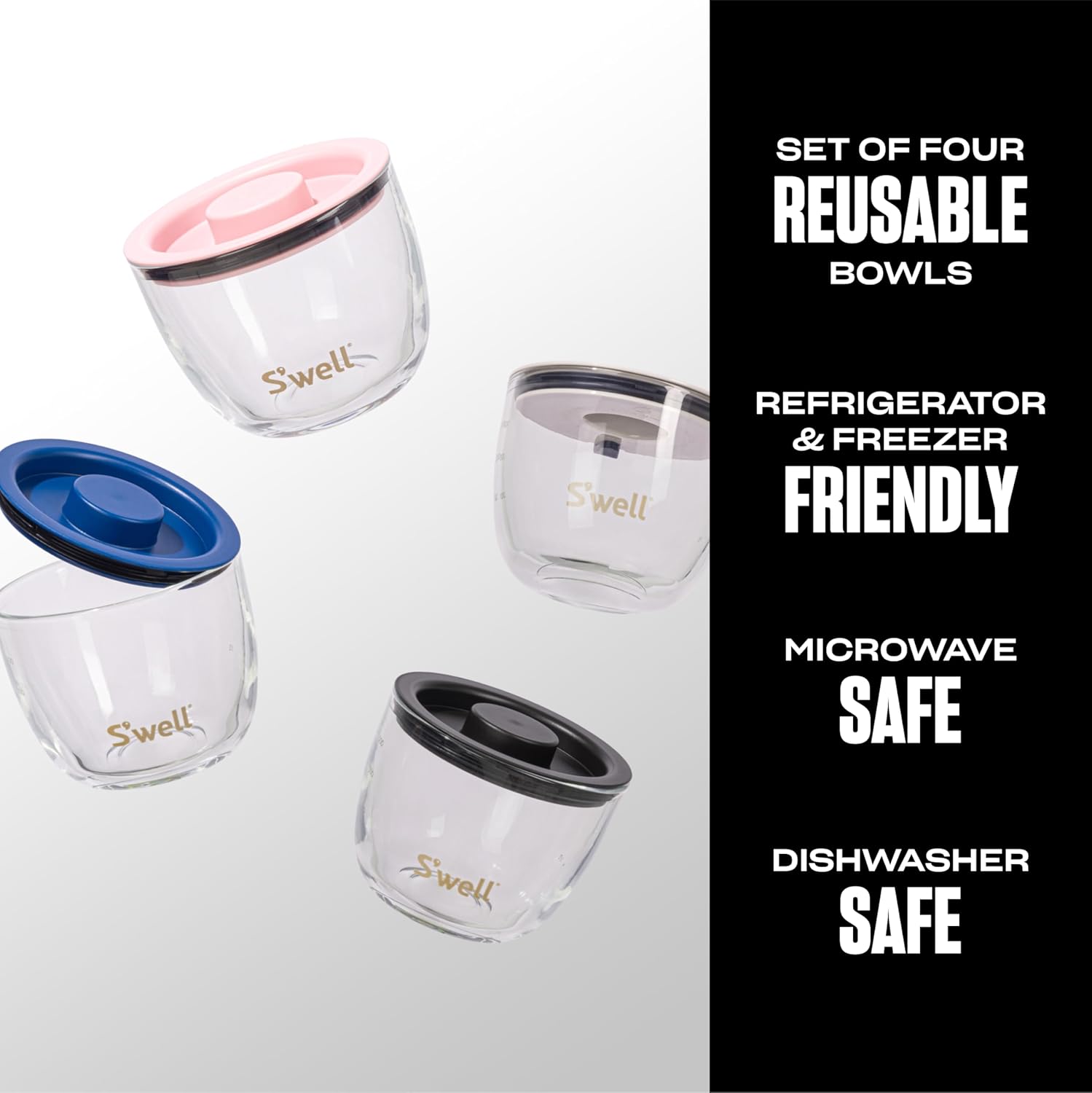 - PREP, NEST, GO: Prep your meals for the day with the Glass Prep Bowl Set including four 12oz bowls. Marked with measurements and nest neatly inside S’well Eats 21.5oz food bowls or can be used alone. Microwaveable and top-rack dishwasher-safe.