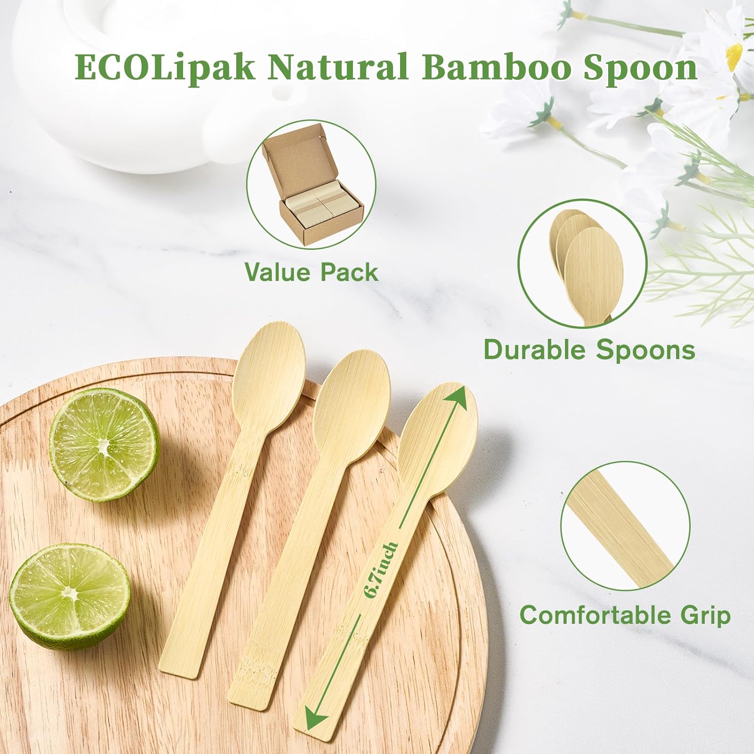 - Environmentally Responsible: Made from fast-growing bamboo, these disposable spoons can be placed directly into the compost bin after use and will decompose naturally within 6-12 months, helping to protect the planet