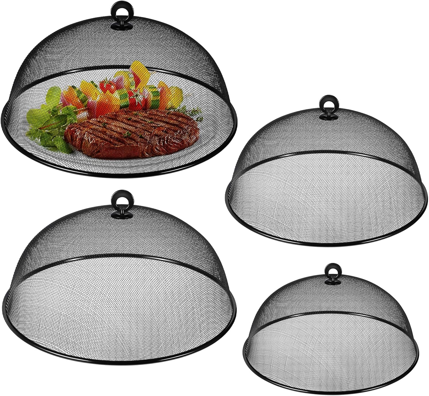 - Multiplicity in Size: every package contains 4 metal mesh food covers for outdoors in black,catering to different consumer needs, metal screen food covers for outdoor eating are available in a variety of sizes, 14 inches, 12 inches, 11 inches, and 10 inches in diameter; Whether you're covering a large salad bowl or a small dessert plate, there's a mesh cover to fit your requirements