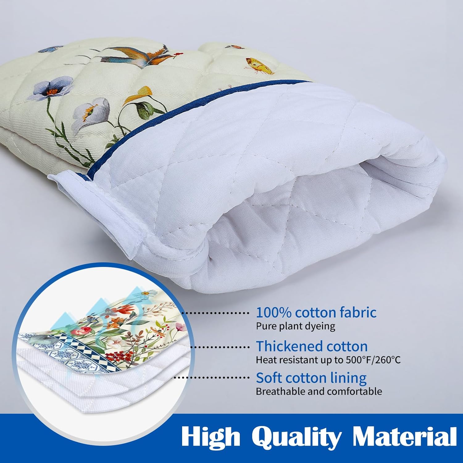 - PREFERRED MATERIAL: Each pot holders & oven mitts set is carefully crafted from 100% cotton, with dyes sourced from plants, digital printing technology and upgraded color fixing process, the colors are bright and fade-resistant. Cotton lining to bring you comfortable and breathable touch and protect your skin as well.