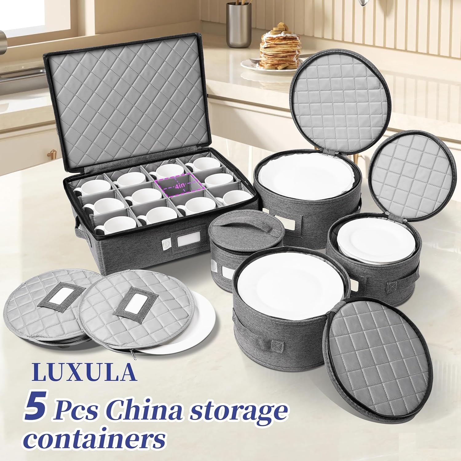 LUXULA China Storage Containers for 12 Place Setting with Two Plate Bags, 5 Pcs Hard Shell Quilted China Storage Cases for Dinner Plates, Salad Plates, Dessert Plates, Saucers, Cups & Mug Storage