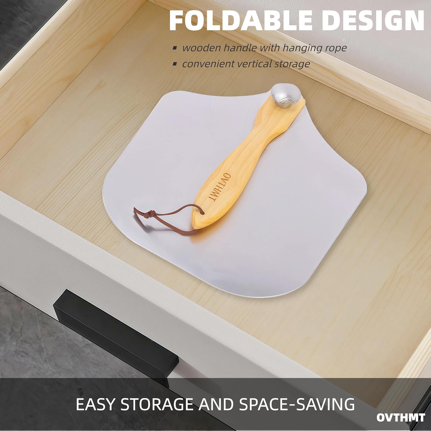 - PREMIUM DESIGN: The metal pizza paddle is 1.5mm thick and weights 1.15lbs. The foldable design wooden handle ensures space-saving storage, while the built-in hole with a hanging rope enables vertical placement.