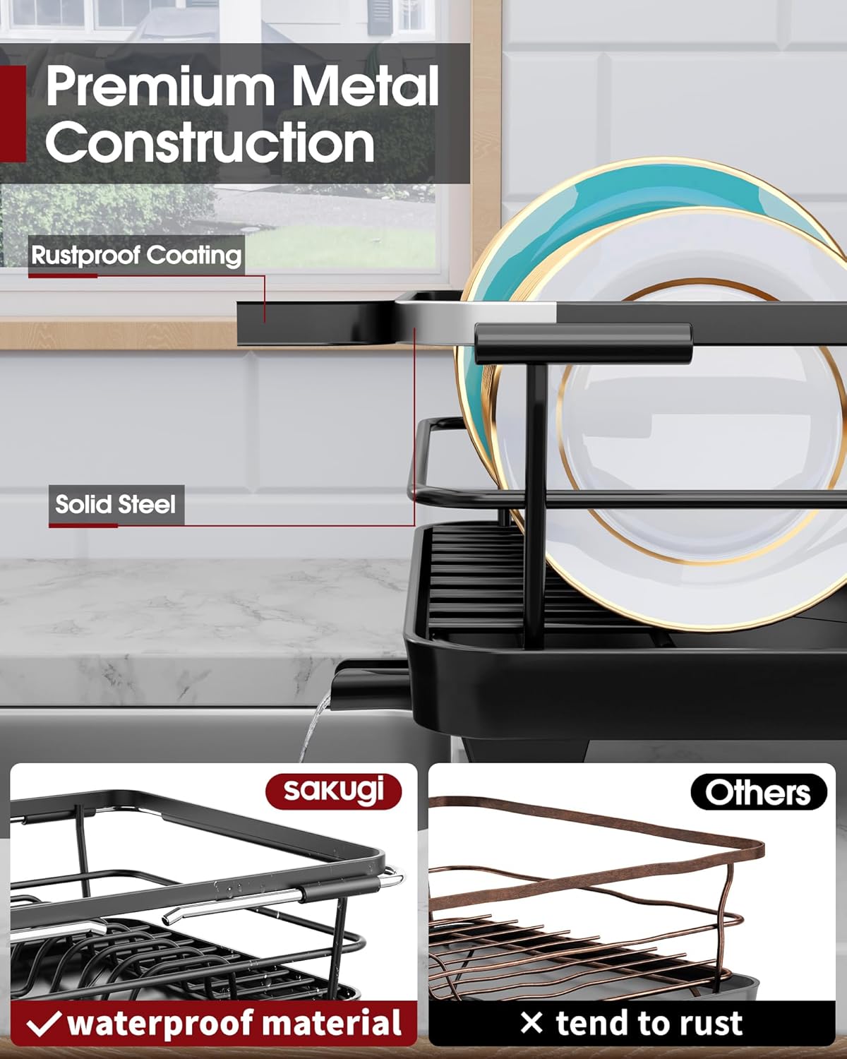- EASY TO MAINTAIN: Sakugi dish drying rack with drainboard features a waterproof and fingerprint-proof black coating. With a simple construction, the dish rack is easy to disassemble to clean. Simply wipe the rack with a damp cloth or rinse it under a running tap if needed. You can effortlessly use and maintain Sakugi dish drainers for kitchen counter.