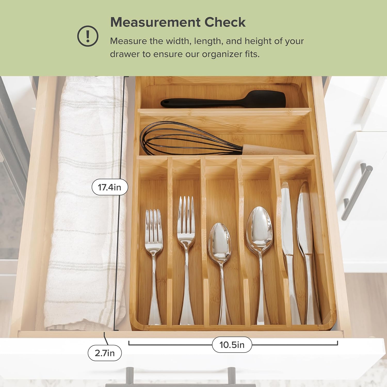 - Perfect Fit for Most Drawers: This kitchen drawer organizer is designed to fit drawers 11” or wider, measuring 17.4” deep, 10.5” wide, and 2.7” tall. It ensures your drawer is maximized, offering a compact solution for all your silverware storage needs. Ideal for any silverware drawer organizer or utensil drawer organizer