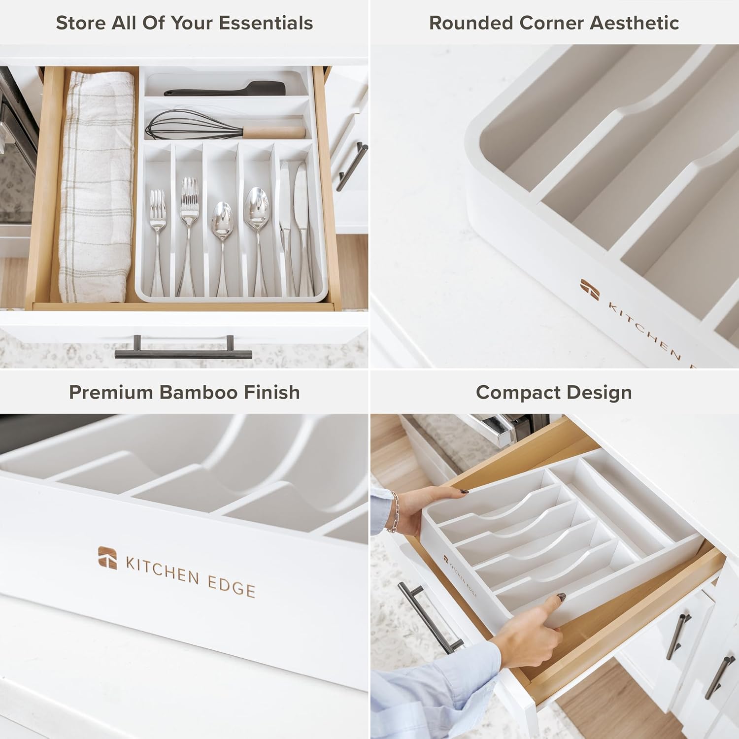 KitchenEdge Silverware Organizer - Cutlery, Flatware, and Utensil Holder for Kitchen Drawers, Fixed 10.5” Width, 7 Storage Compartments, Non-Slip Feet, Rounded Corners, 100% Bamboo, White Finish