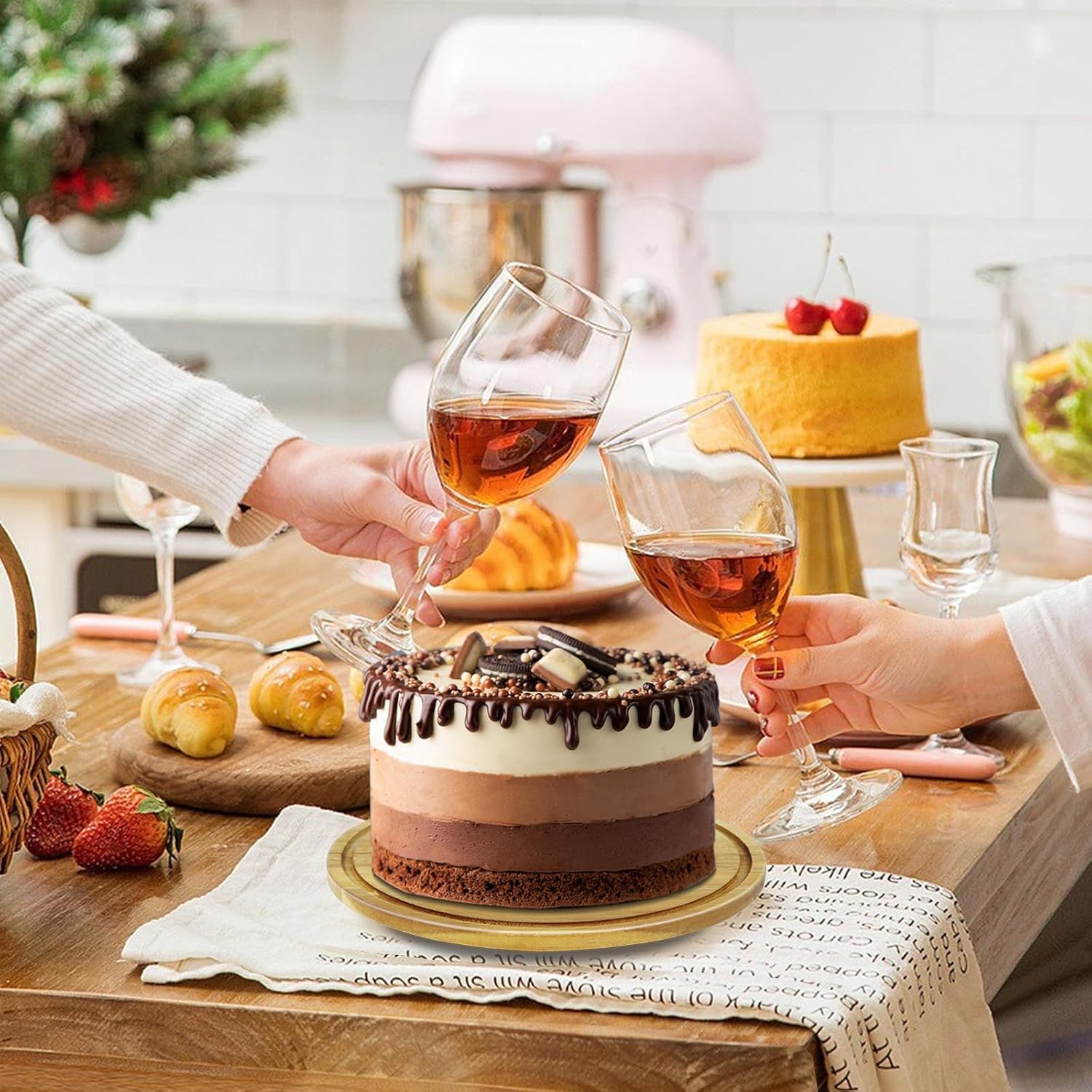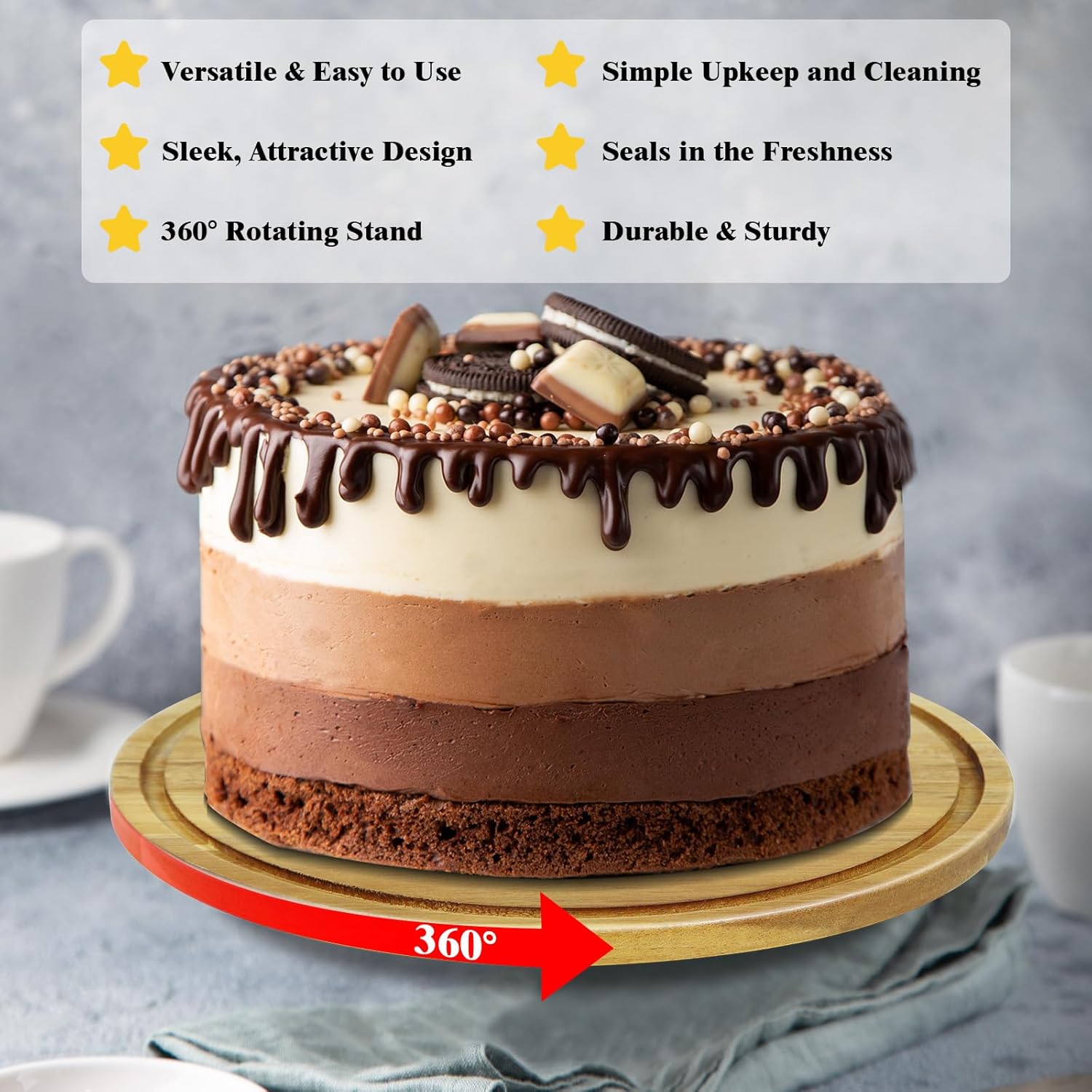 - 【Practical and beautiful】Rotatable cake serving tray brings sophistication to any decor,whether it's an indoor entertaining or an outdoor wine tasting party,you can use it to show off your food!Acacia wood grain is very delicate and beautiful, making it a perfect decoration for any occasion.