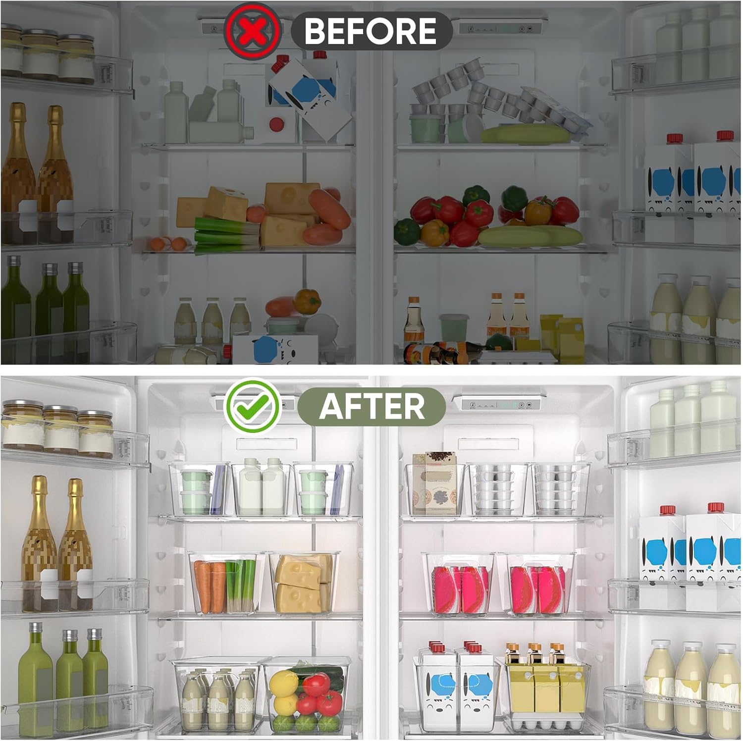- Stackable: These plastic storage bins are stackable, allowing you to maximize vertical space regardless of how many bins you use; The fridge organizer is made of high-quality PET material, which is strong and durable, quite clear so that you can access your items without looking for them