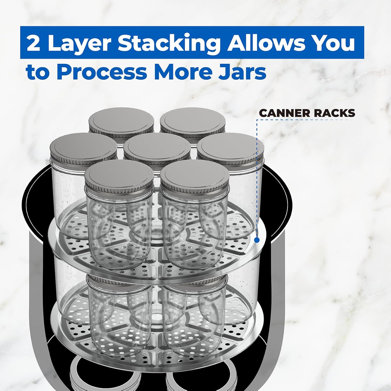 - 【2 CANNING RACK】Perfect for stacking pint jars! With the extra canning rack, you can add more pint jars or jelly jars to the canner without the criss-crossing.