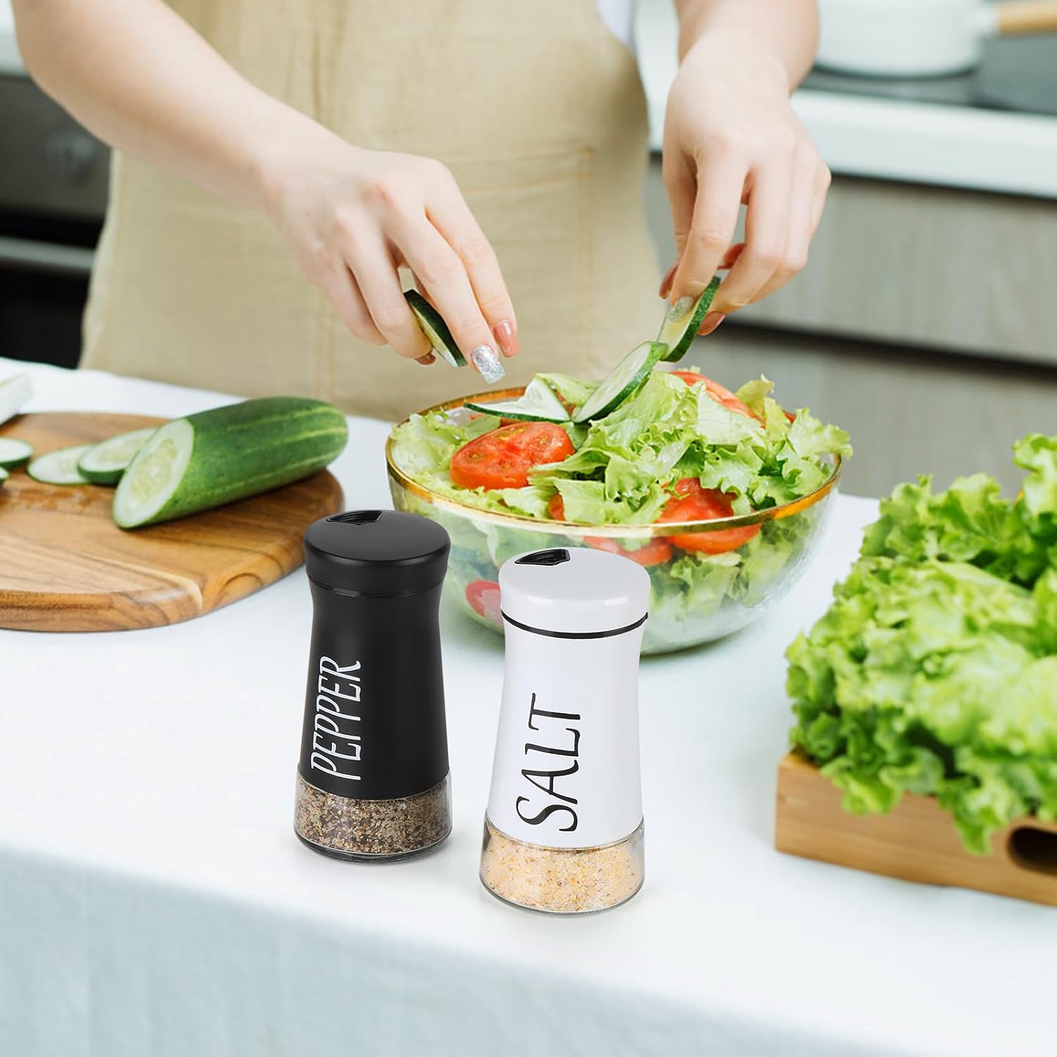 - Convenient Visual Design:The container is labeled with salt or pepper text, so even at a glance it's easy to tell which is which. And the visible glass bottle bottom design allows you to know when to refill.
