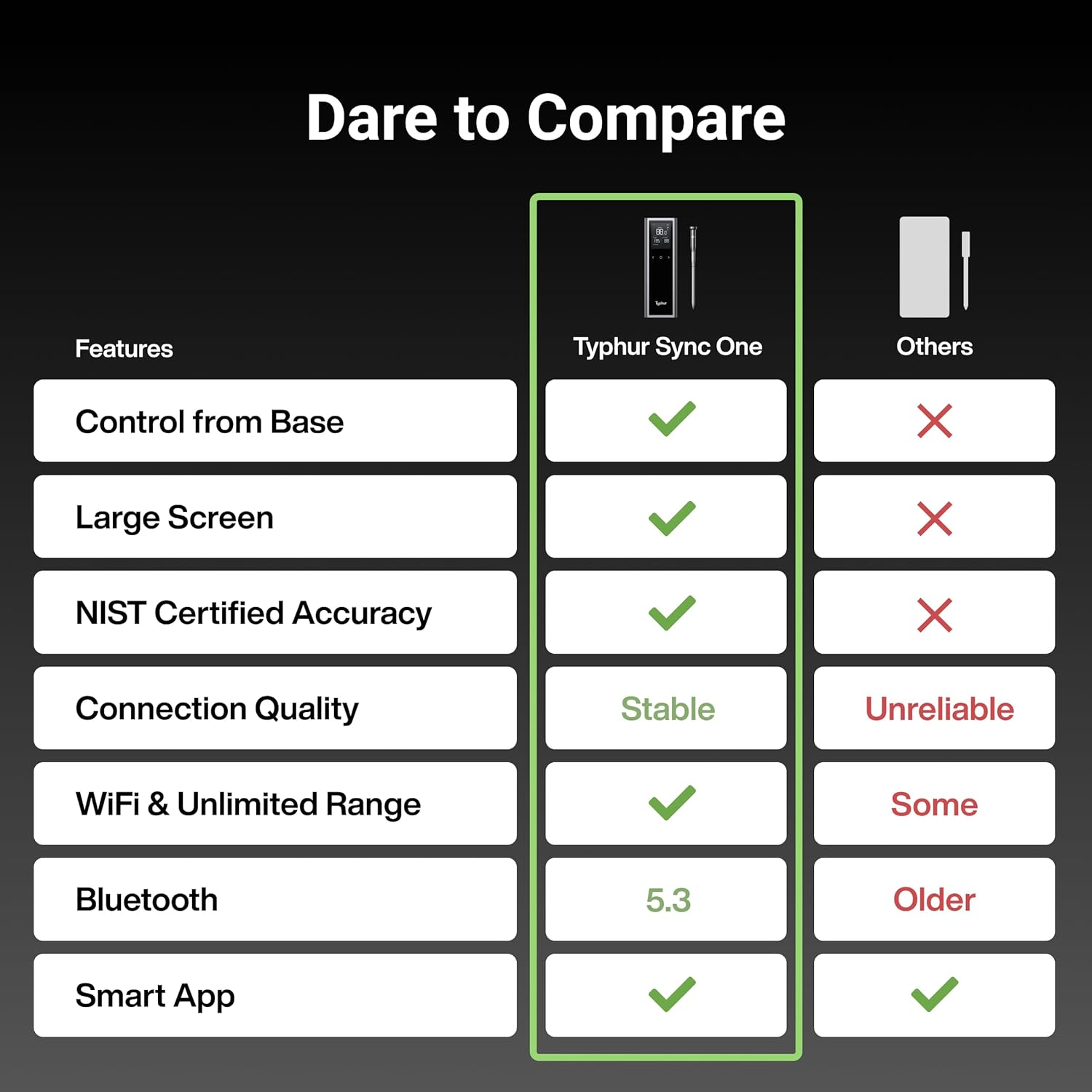 - Monitor Anywhere with WiFi: Stay connected to your cooking with the Typhur app by linking the meat thermometerstation to 2.4GHz WiFi. Effortlessly track your meat temperature on the go, with no distance limitations.