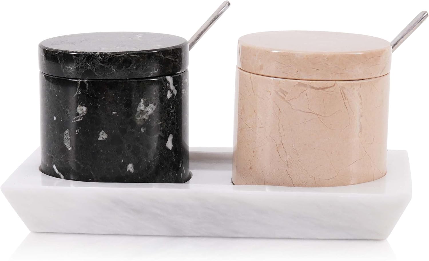 - Functional Design with Lid & Tray - Includes two salt cellar containers with matching lids and a marble tray to keep salt, pepper, orspices fresh and organized on your countertop.