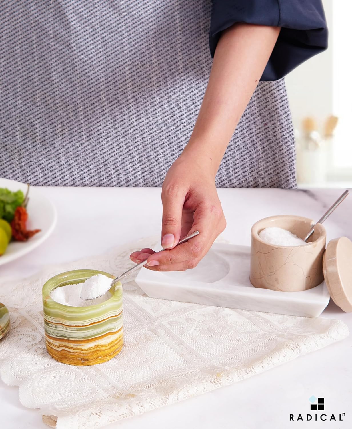 - WHAT IS INCLUDED - Set of 2 Salt Cellar With Spoon And 1 x Tray. Comes Along With RADICALn Branded Secure Packaging.
