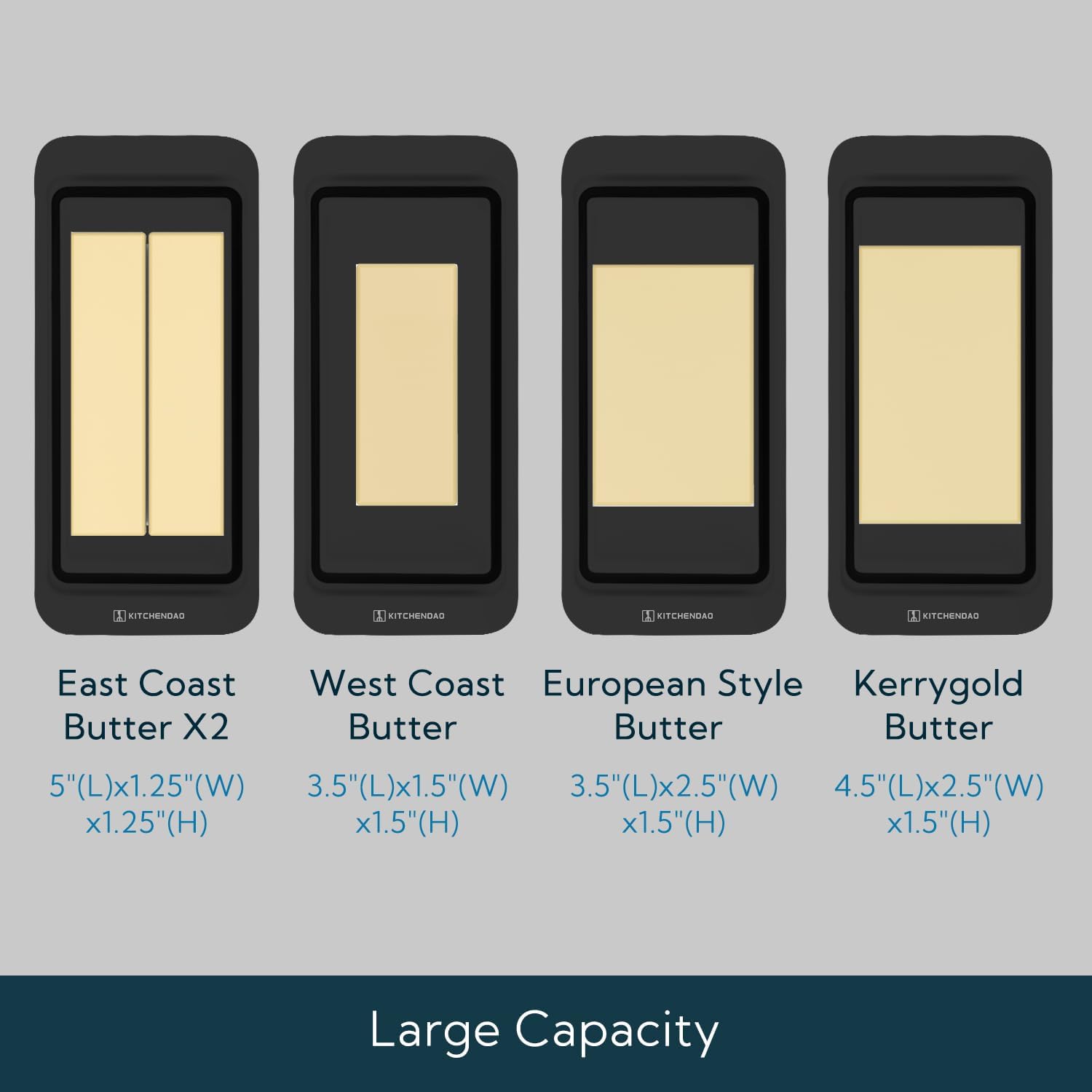 - Large Capacity: The large butter dish with cover is suitable for Eastern, Western, European style and Kerrygold butter, cream cheese. The butter keeper can hold up to 2 sticks of eastern butter