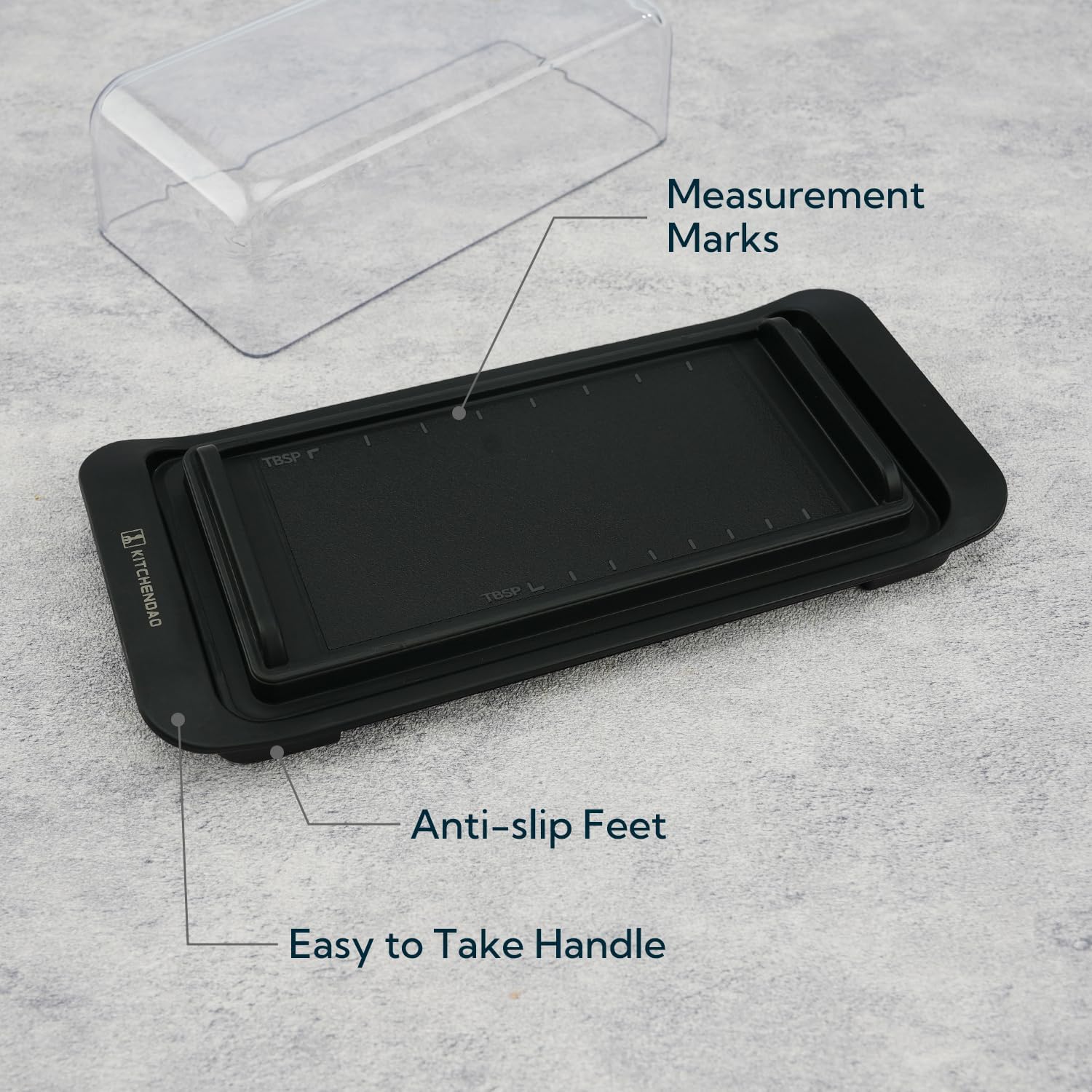 - Measurement Marks & Anti-slip Bottom: Has TBSP marks and slight recess for the butter to stay in place. The scale lines on the butter tray can help you control the calorie intake and measure the butter you need. Anti-slip bottom makes the plastic butter holder more stable and stay in place when cut the butter