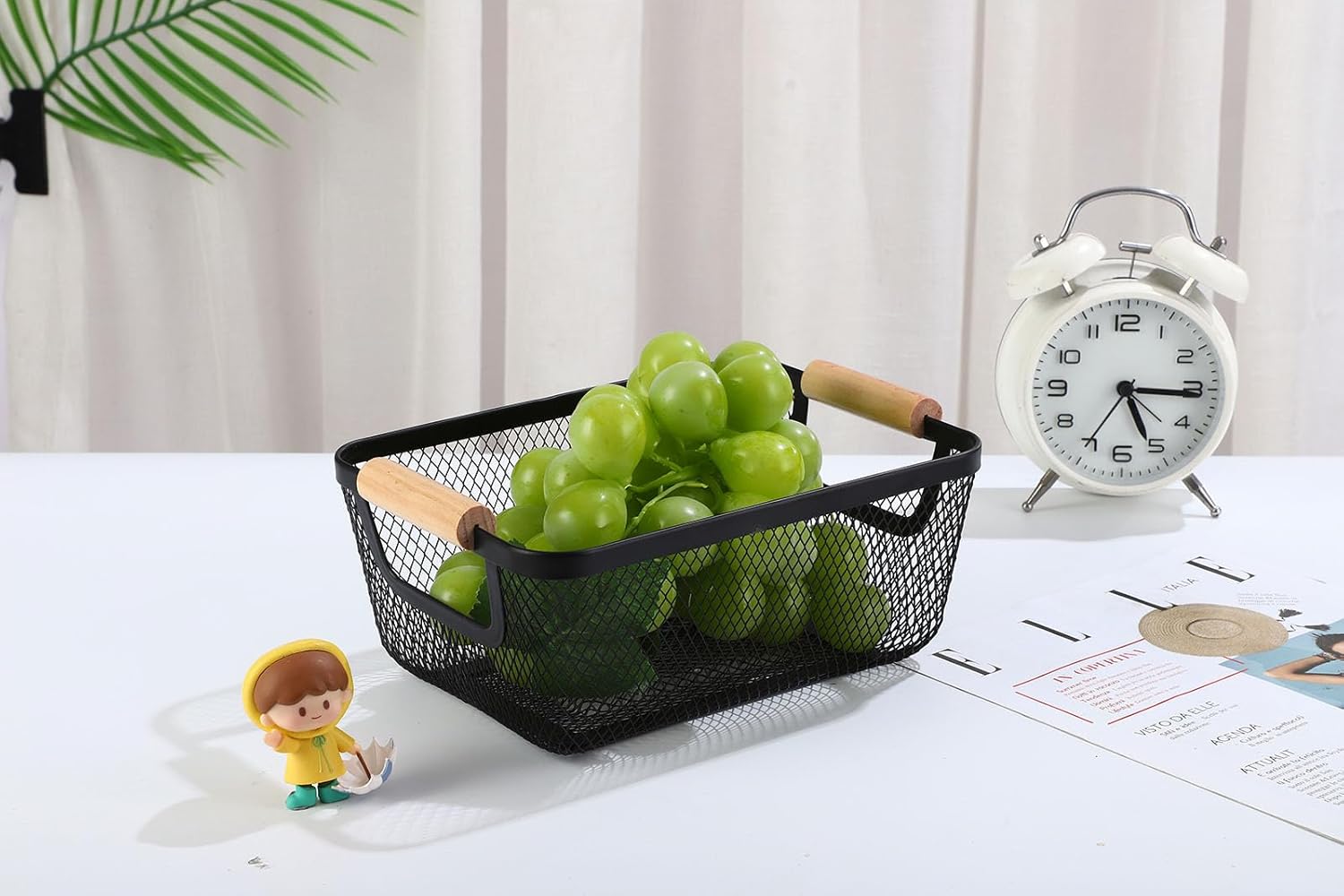 - The metal mesh storage organizer basket bin with wooden handle is a great way to organize or decorate your home, office, apartment, lofts, or other living spaces. This wire basket also can be a fruit basket or garden basket and storing those fruits and vegetables outside the refrigerator. Also as extra storage to meet your needs for household use.