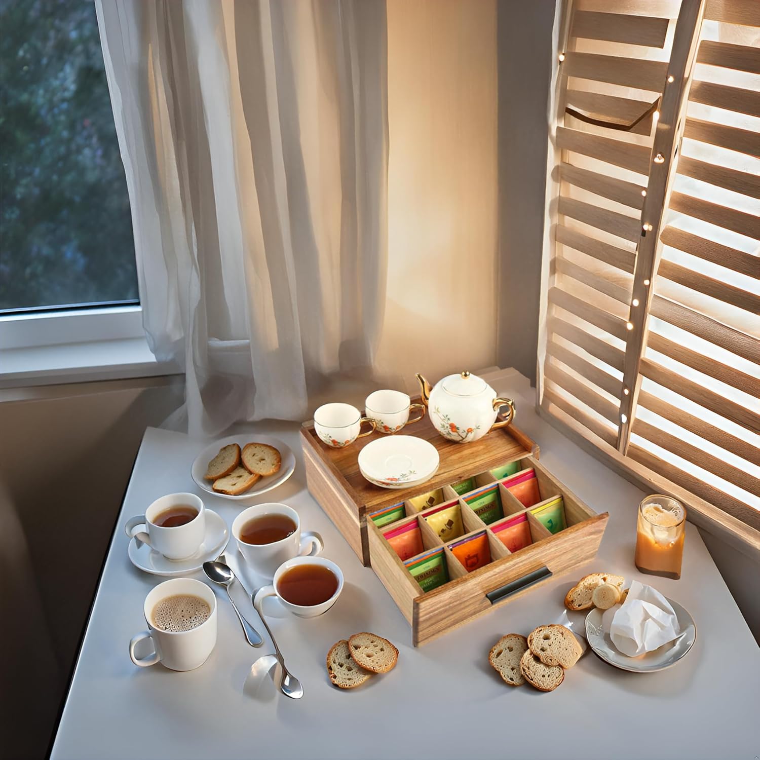 Acacia Wood Tea Bag Organizer - 12-Compartment Capacity Tea Box Organizer Storage Box with Drawer, Tea Accessories for Tea Bags Storage Drawer, Tea Station for Countertop