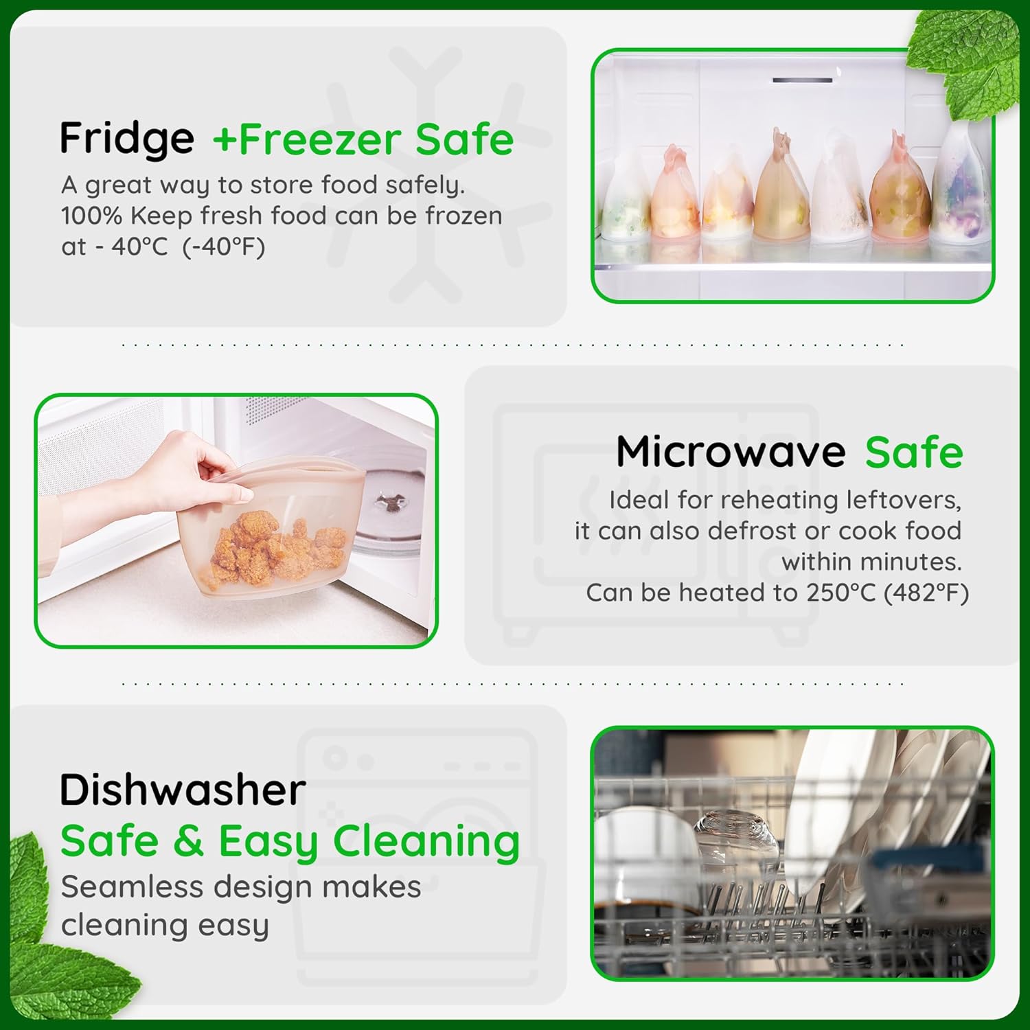 - Triple-Layer Airtight Seal: Seal in freshness and flavors with the reusable silicone bagsβ secure, leak-proof seal- perfect for storing snacks, leftovers, and meal prep. A curved wide opening makes filling and cleaning effortless