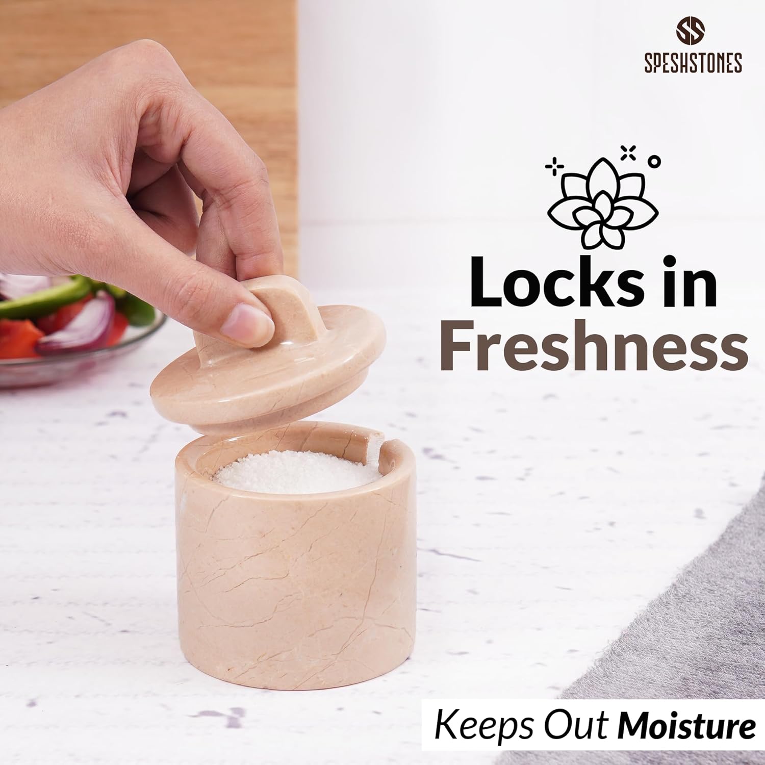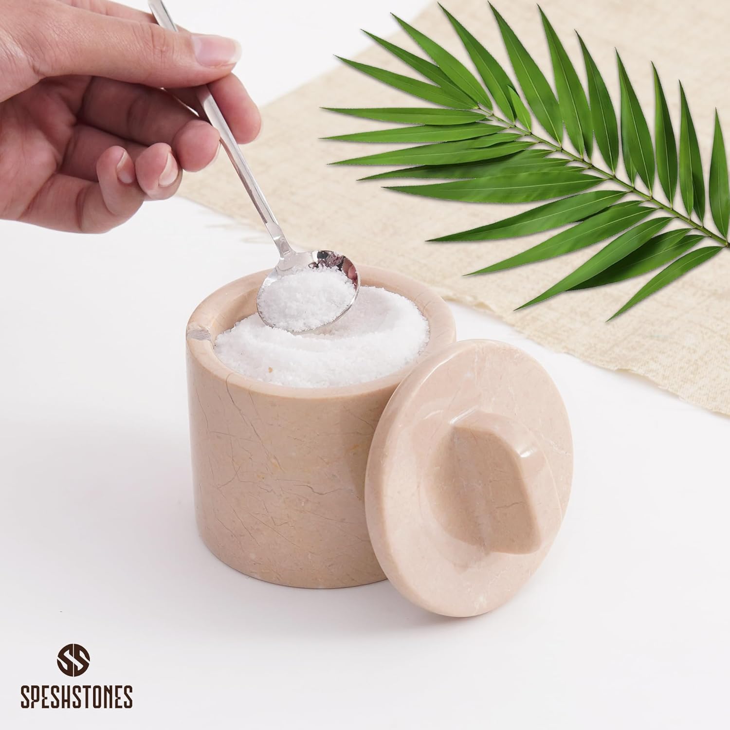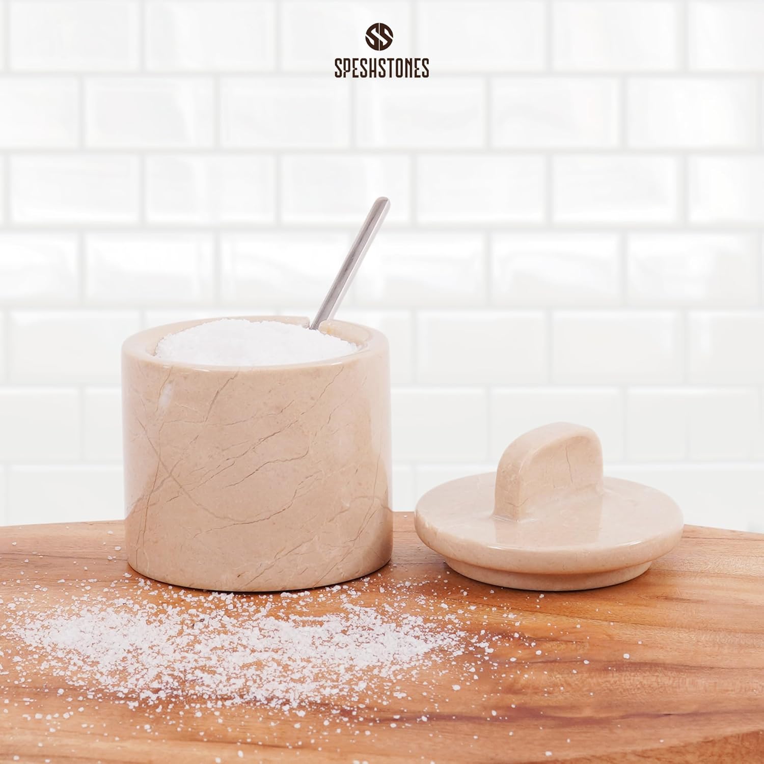 - WHAT IS INCLUDED - 1 x Marble Salt Cellar with Lid and Spoon. Comes along with SPESHSTONES Branded Secure and Fragile Packaging.