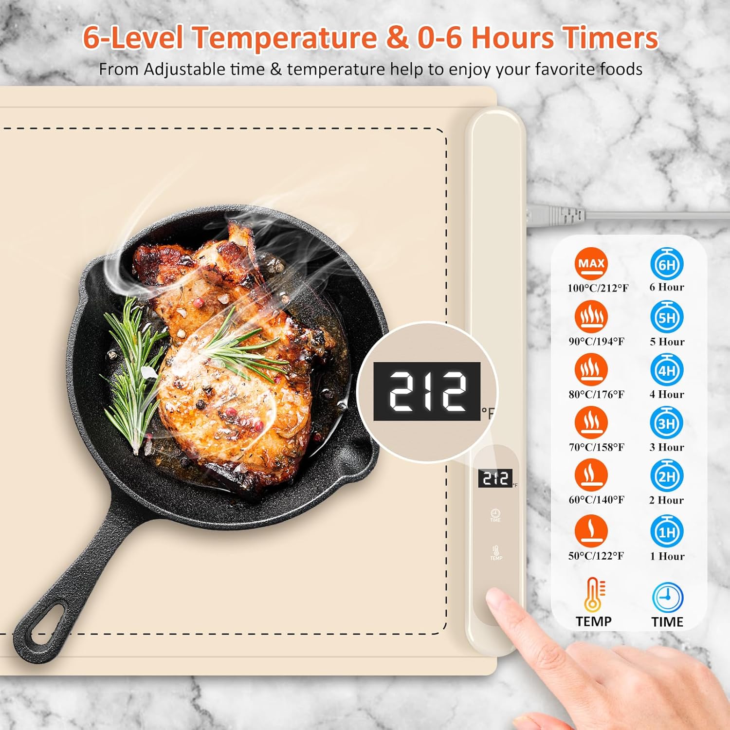 - 【Adjustable 6-Level Temperature & 6 Timer Settings】The heating mat for food providing six temperature levels from 122 ℉ to 212 ℉, covering low to high temperatures, adapting to your different food warming needs. In addition, our food warming mat are equipped with a 1-2-3-4-5-6 hours 6-speed timer function, to keep your food warm and lock the freshness.