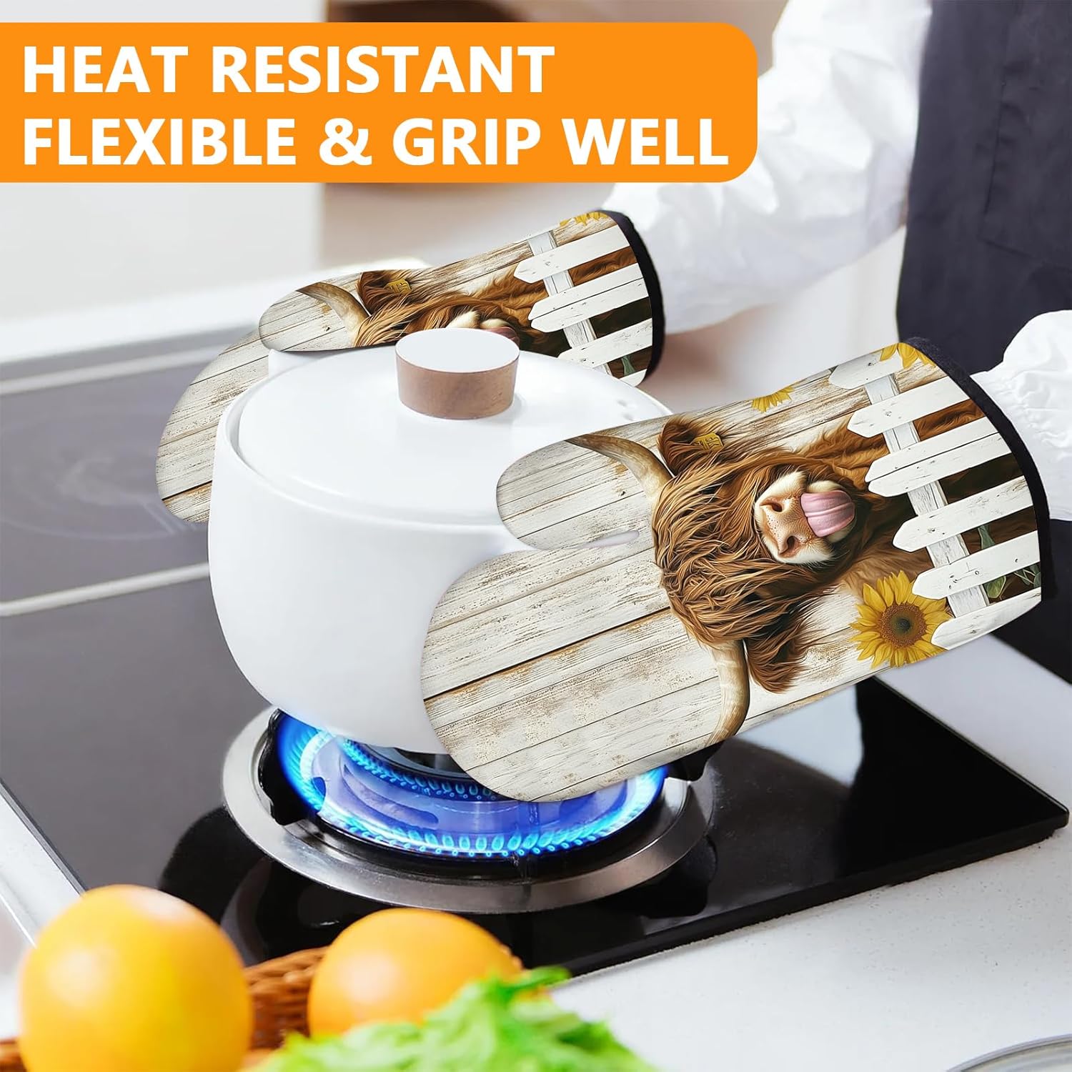 Sunflower Highland Cow Oven Mitts and Pot Holders Sets 4Pcs,Extra Long Oven Gloves Potholder for Kitchen Cooking Baking BBQ 100% Cotton Heat Resistant