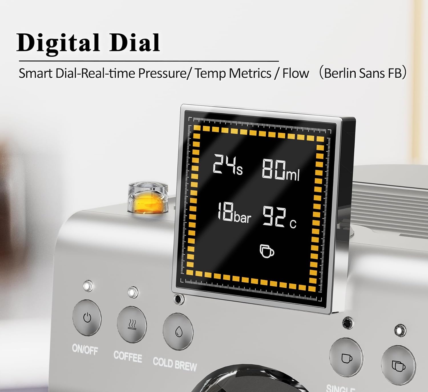 - 🌡️Cold Brew & Hot Espresso Machine : Enjoy both icy cold brew and steamy espresso with independent extraction channels! Switch between cold and hot at the touch of a button. The indicator light on the espresso maker displays the real-time hot and cold status extracted. Barista-Grade Digital Display: Become a home barista with real-time data on this espresso coffee maker! Monitor flow (40/80ml), pressure (1-20 bar), brewing time (1-60s), temperature (92°C/197.6°F), and single/double cup selection