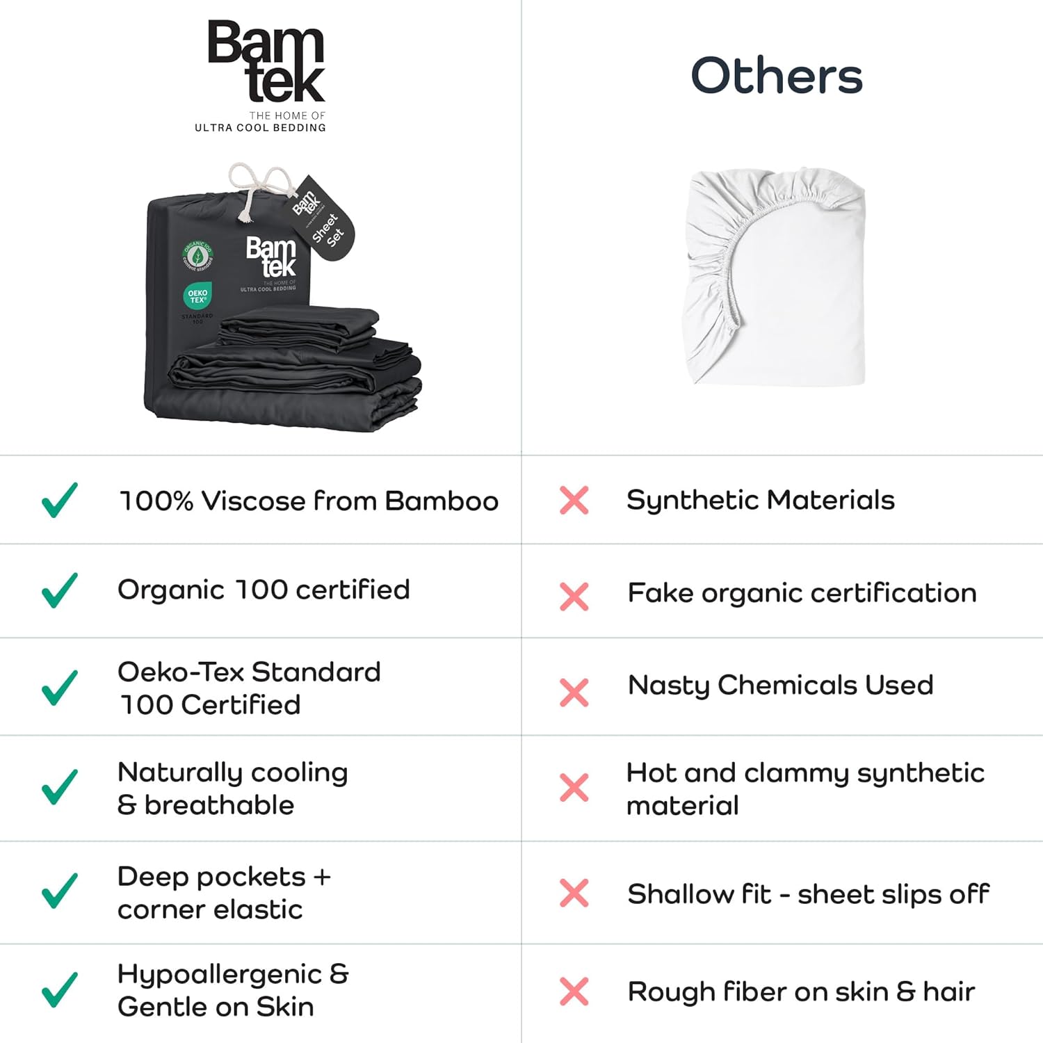 - Because You Deserve Better: Say goodbye to harsh chemicals, Bamtek 100% Viscose Bamboo Sheets are organically certified & Oeko Tex standard 100 certified - skin friendly, a hypoallergenic bedding and those who value pure natural comfort.