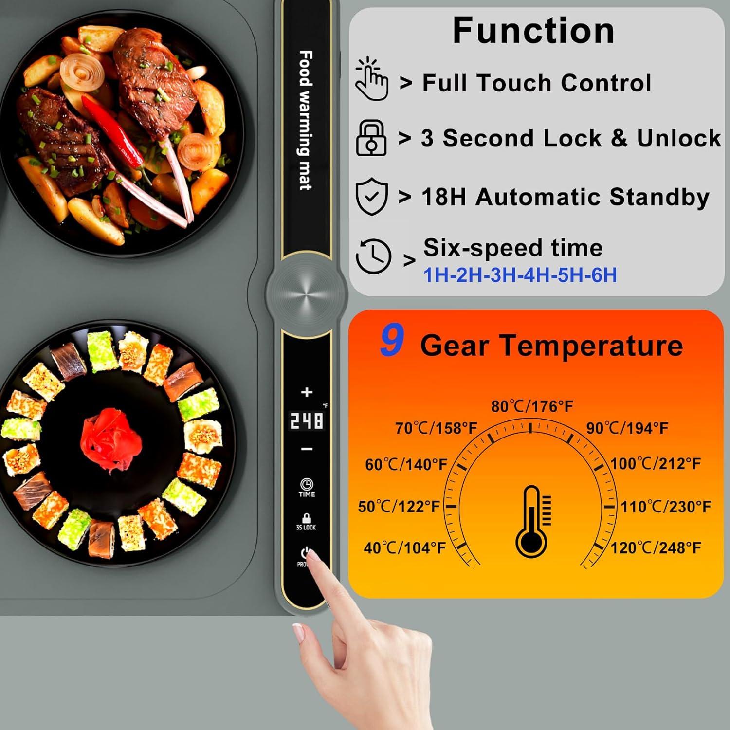 - Variety of Functions: This rollable food warmer mat features has 9_level adjustable temperature from 104β to 248β (40β-120β). Maximum 6-hour timing model and 18-hour auto shut-off timer. The touch screen design allows you to easily operate the food warm tray
