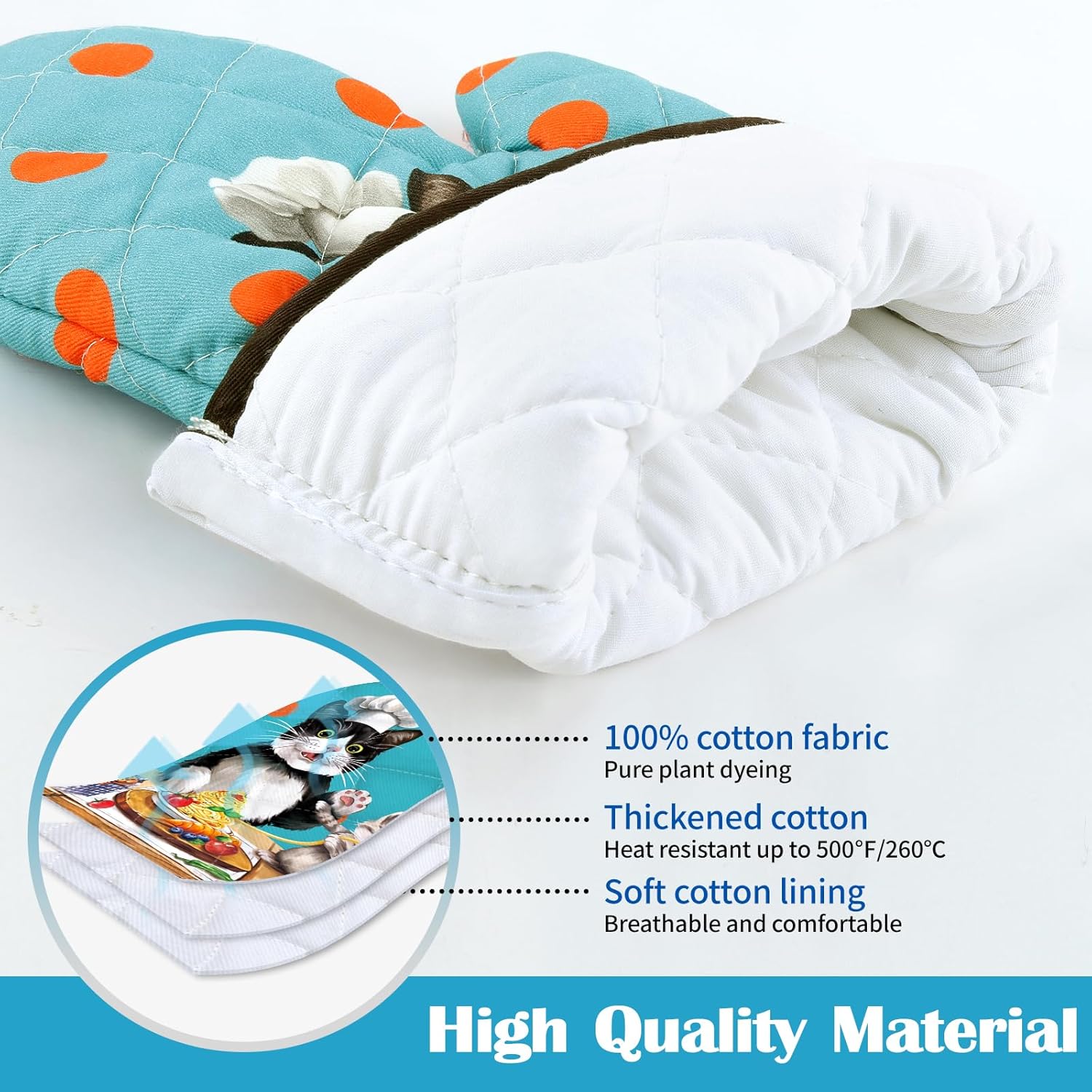 Cute Cat Oven Mitts and Pot Holders Sets 2Pcs, 100% Cotton Heat Resistant, Extra Long Oven Gloves Potholder for Kitchen Cooking Baking Decoration