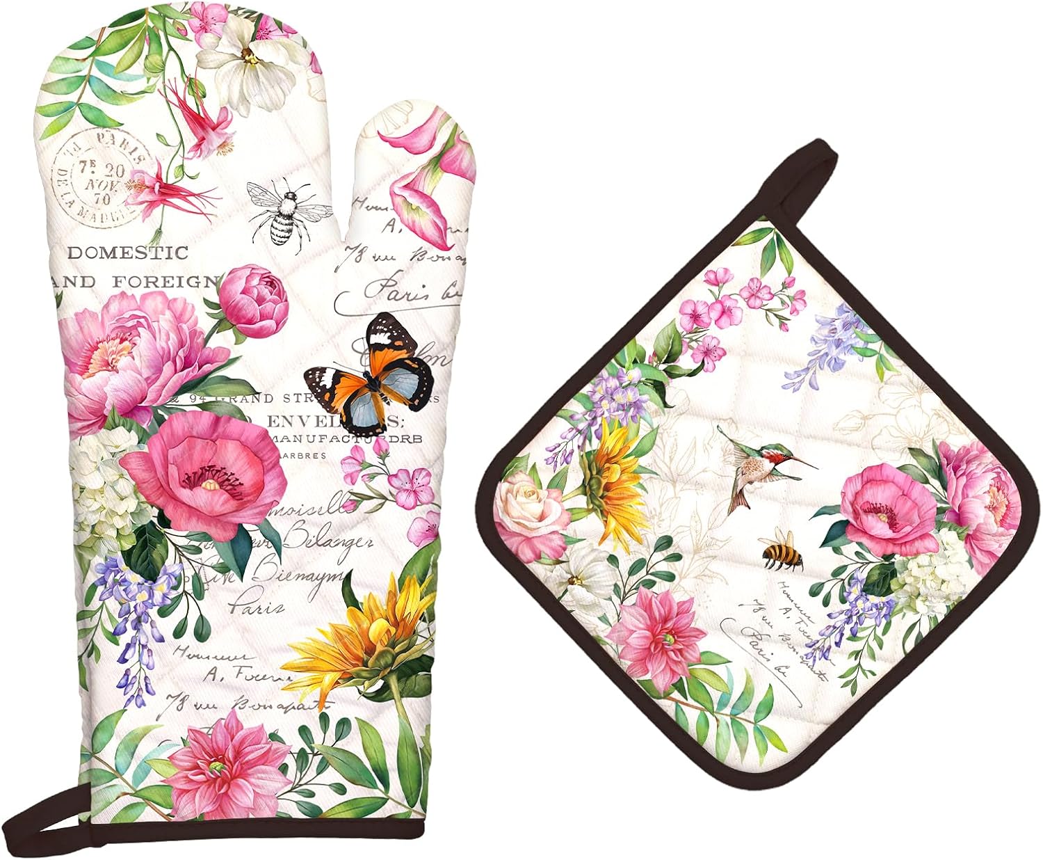 Vintage Flower Oven Mitts and Pot Holders Sets 2Pcs, 100% Cotton Heat Resistant, Extra Long Oven Gloves Potholder for Kitchen Cooking Baking Decoration