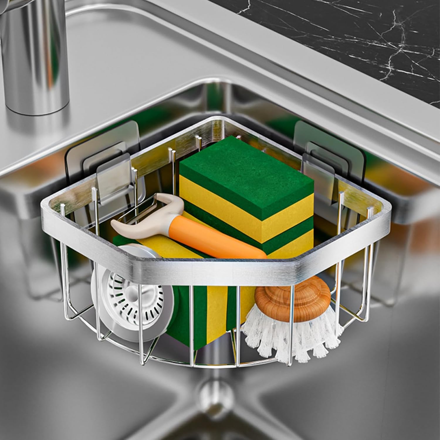 Sponge Holder Corner Sink Caddy Sink Organizer for Kitchen Bathroom Stainless Steel Triangle Soap Holder with 2 Pcs Adhesive Hook(L)