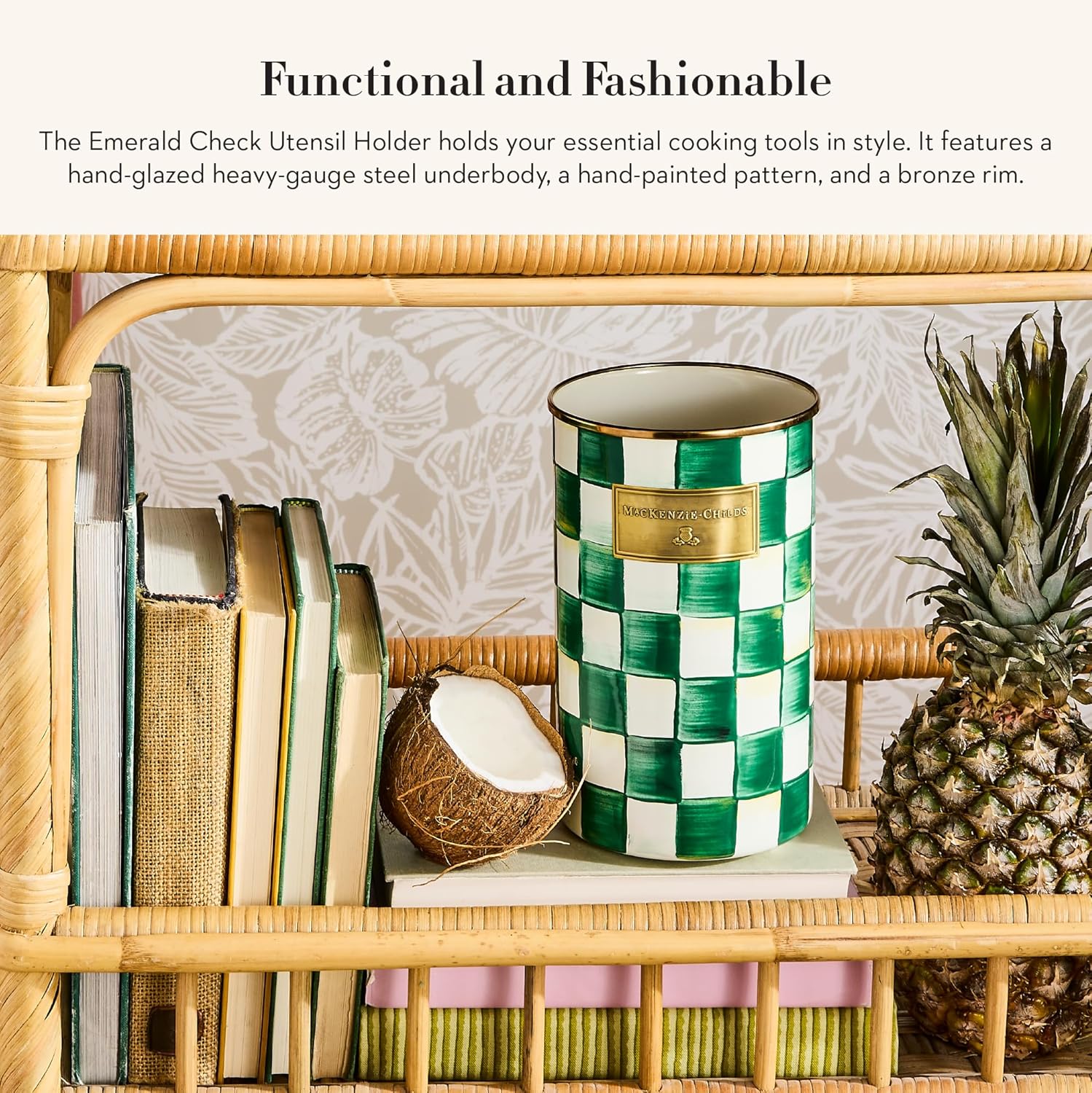 - KITCHEN DECOR ESSENTIAL: Our Emerald Check serving utensil holder is an ideal kitchen container with an enchanting pattern. This utensil storage caddy features hand-painted color-dragged green-and-white checks and makes any space whimsical.
