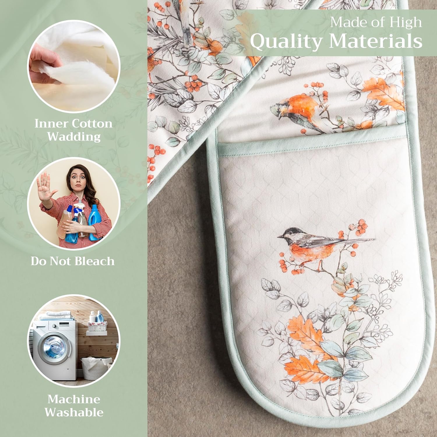 - 100% QUILTED COTTON - Unlike other double oven mitts, we only use the best quality cotton to ensure that only the finest gloves produced end up on your hands