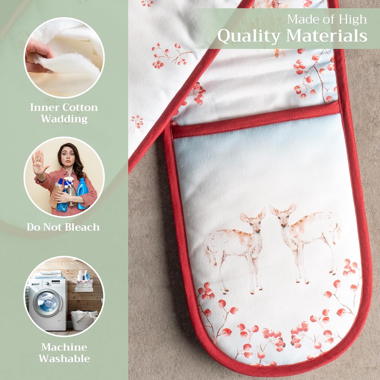 - 100% QUILTED COTTON - Unlike other double oven mitts, we only use the best quality cotton to ensure that only the finest gloves produced end up on your hands