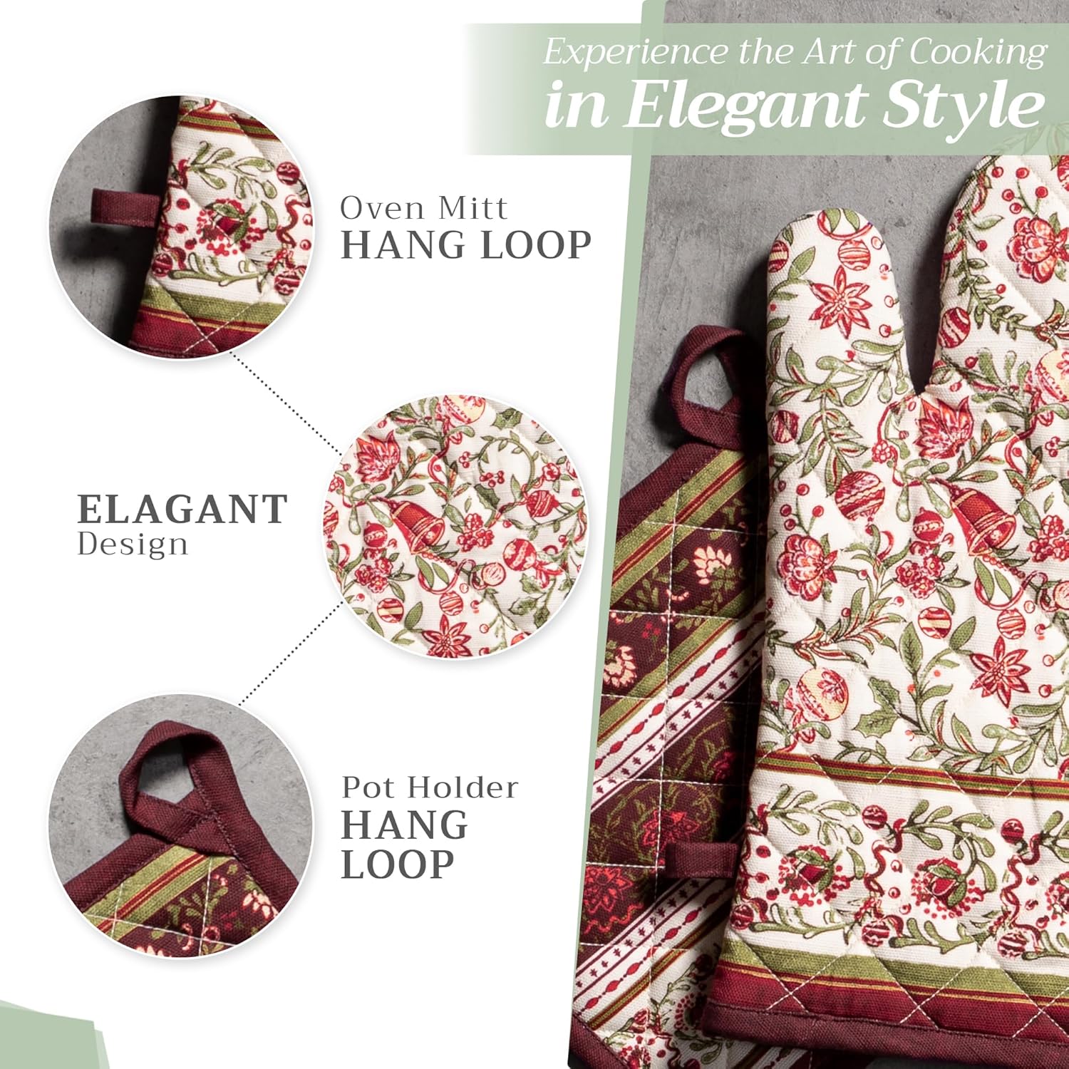 - Artistic style: Add charm to your kitchen with our oven mitt pot holder set featuring watercolor designs inspired by traditional European motifs. Stylish and functional kitchen accessories for every home cook or gift occasion.