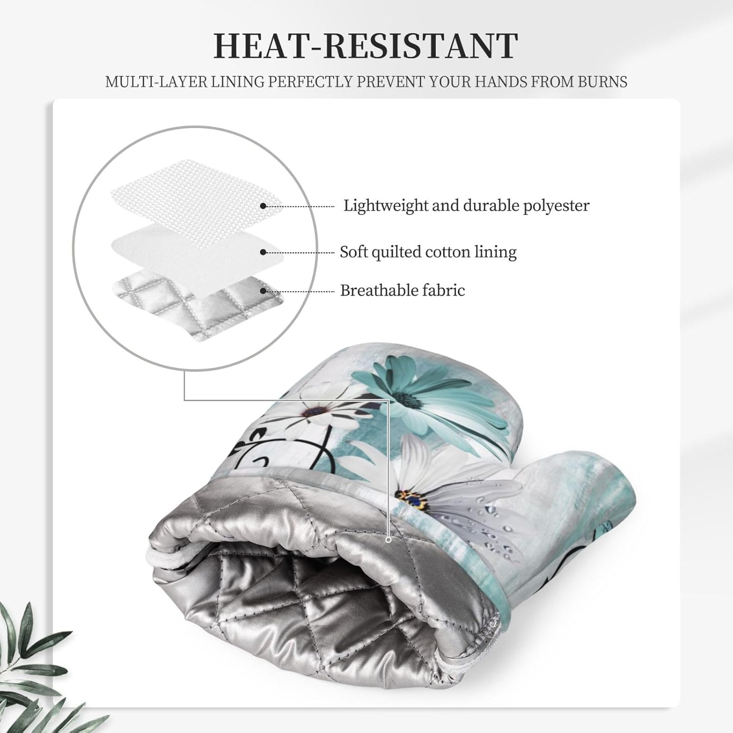 - MATERIAL: These farm teal daisy floral oven mitts and pot holders made of polyester material, the surface with silicone and the lining is filled with soft cotton, which is comfortable to the touch, flexible to hold, making it a great choice for use in kitchen ovens or hot soup pots