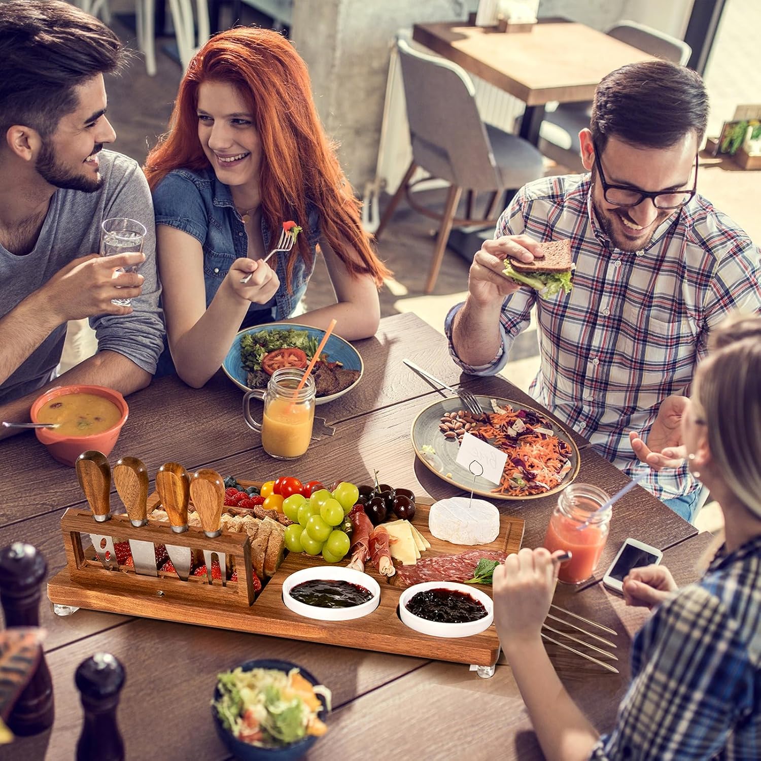 - COMPLETE SET: Premium Acacia charcuterie board - wooden charcuterie board set with knives featuring 4 cheese knives with foldable knife holder, 2 ceramic bowls, 4 fruit forks and dedicated large spaces for arranging meats and cheeses. Ideal for events and gatherings