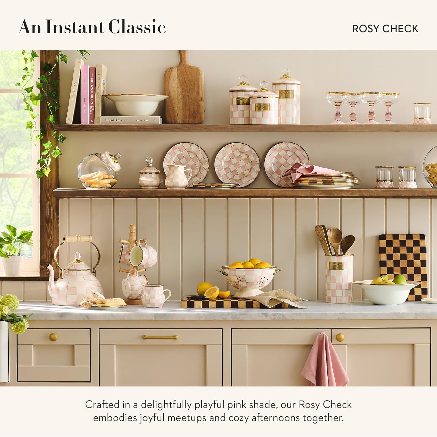 MACKENZIE-CHILDS Enamel Salad Serving Set, Enamel Bowl and Wooden Salad Servers, Decorative Kitchen Set, Pink-and-White Rosy Check
