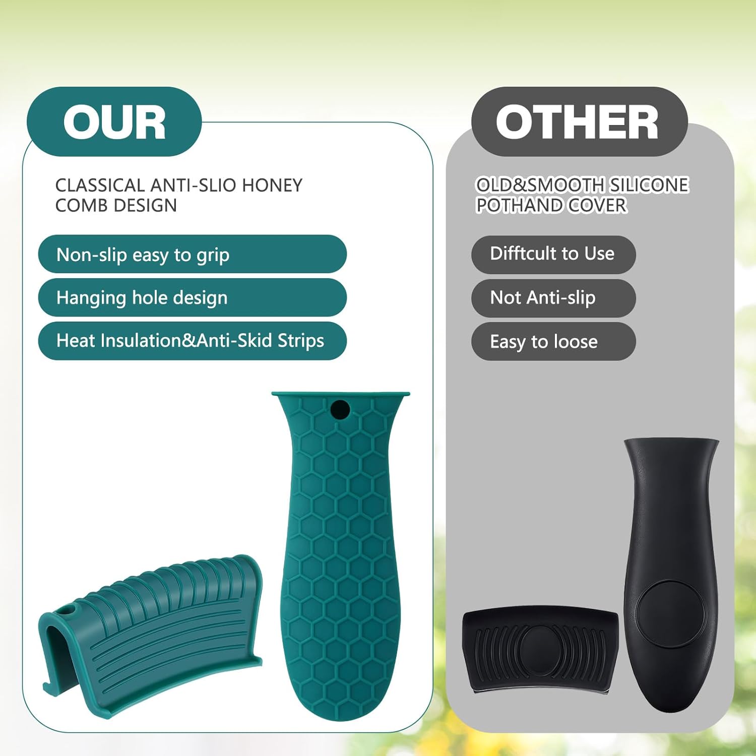 - Anti-slip design: these hot resistant pot sleeve grip handle holders feature honeycomb pattern design on the outside and concave-convex design on the inside to make the handle holder grip stronger and less slippery; The silicone hot skillet handle cover has a handy hanging hole if you prefer to store on a hook, making cooking, baking, etc. in your kitchen easier and fun