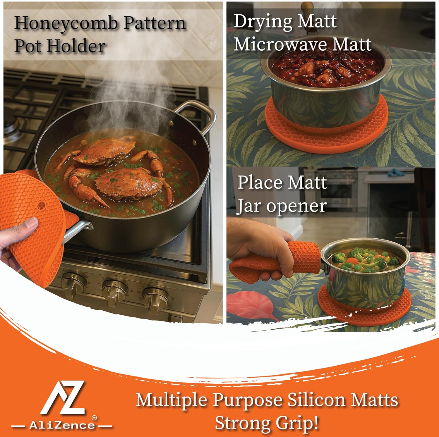 - Complete 6-Piece Kitchen Set: The AliZence Kitchen Essentials Set Includes two long silicone gloves (13 inches), two silicone pinch gloves, and two round hot trivet mats, designed for handling hot cookware safely.